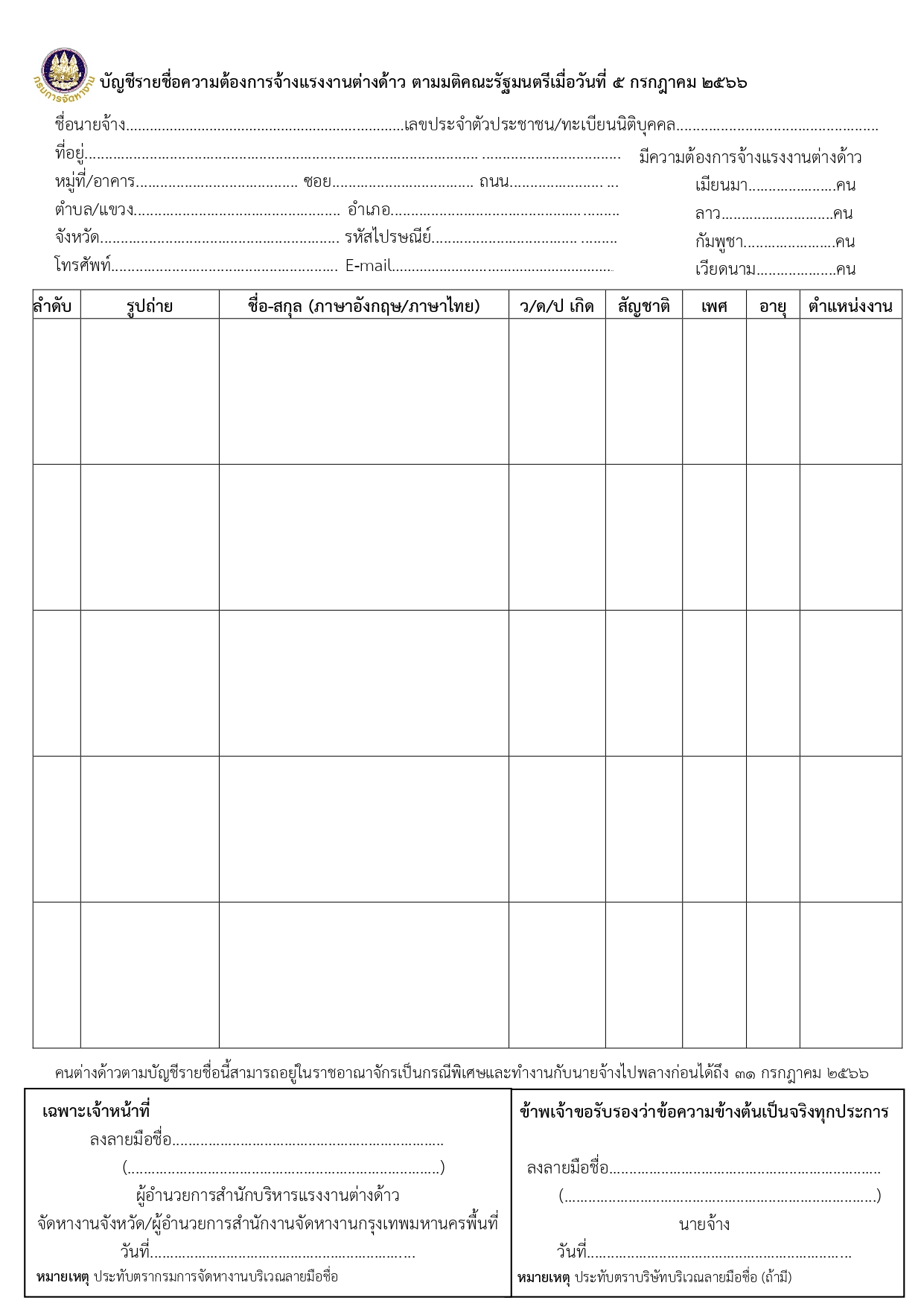 แบบบัญชีรายชื่อความต้องการจ้างแรงงานต่างด้าว ตามมติคณะรัฐมนตรีเมื่อวันที่ 5 กรกฎาคม 2566