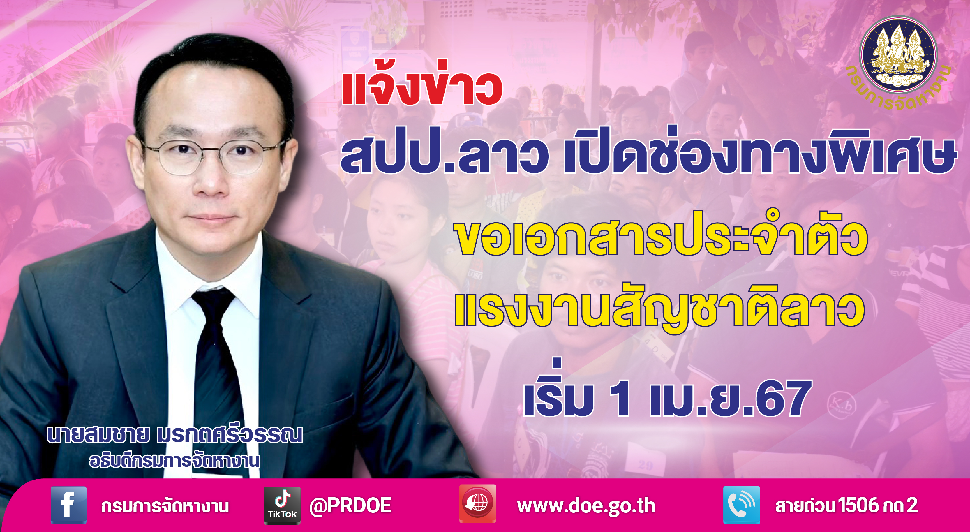 นายสมชาย มรกตศรีวรรณ อธิบดีกรมการจัดหางาน เปิดเผยว่า มติครม.เมื่อวันที่ 3 ตุลาคม 2566 กำหนดให้แรงงานข้ามชาติ ที่ยื่นคำขออนุญาตทำงาน (แบบ บต. 50) ผ่านเว็บไซต์ e-workpermit.doe.go.th และชำระค่าธรรมเนียมใบอนุญาตทำงานแล้ว สามารถทำงานได้ถึงวันที่ 13 กุมภาพันธ์ 2568 โดยต้องดำเนินการจัดเก็บข้อมูลอัตลักษณ์บุคคล จัดทำหนังสือเดินทางหรือเอกสารใช้แทนหนังสือเดินทางเพื่อตีวีซ่า และจัดทำหรือปรับปรุงทะเบียนประวัติ ภายในวันที่ 31 ตุลาคม 2567 ซึ่งล่าสุดทางการลาวได้แจ้งว่ามีความพร้อมในการออกเอกสารประจำตัวของแรงงานสัญชาติลาว โดยเปิดช่องทางพิเศษ เพื่อความรวดเร็วในการจัดทำและออกเอกสารประจำตัว ซึ่งจะเริ่มดำเนินการตั้งแต่วันที่ 1 เมษายน 2567 เป็นต้นไป และขอให้ทางการไทยประชาสัมพันธ์แนวทางดำเนินการให้นายจ้าง สถานประกอบการ และแรงงานสัญชาติลาวทราบ