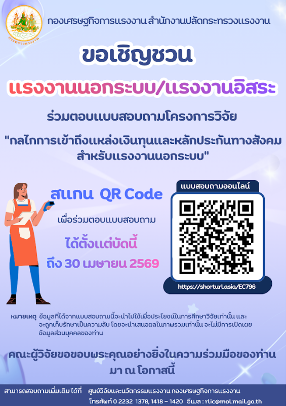 ขอเชิญชวนแรงงานนอกระบบ/แรงงานอิสระ ร่วมตอบแบบสอบถามโครงการวิจัยกลไกการเข้าถึงแหล่งเงินทุนและหลักประกันทางสังคมสำหรับแรงงานนอกระบบ