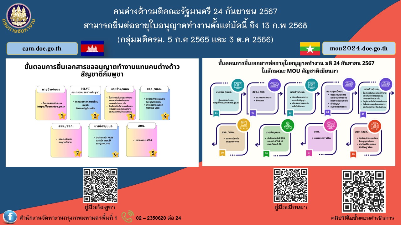 คนต่างด้าวมติคณะรัฐมนตรี 24 กันยายน พ.ศ. 2567 สามารถยื่นต่ออายุใบอนุญาตทำงาน ตั้งแต่บัดนี้ ถึง 13 กุมภาพันธ์ 2568 (กลุ่มมติครม. 5 ก.ค. 2565 และ 3 ต.ค. 2566)