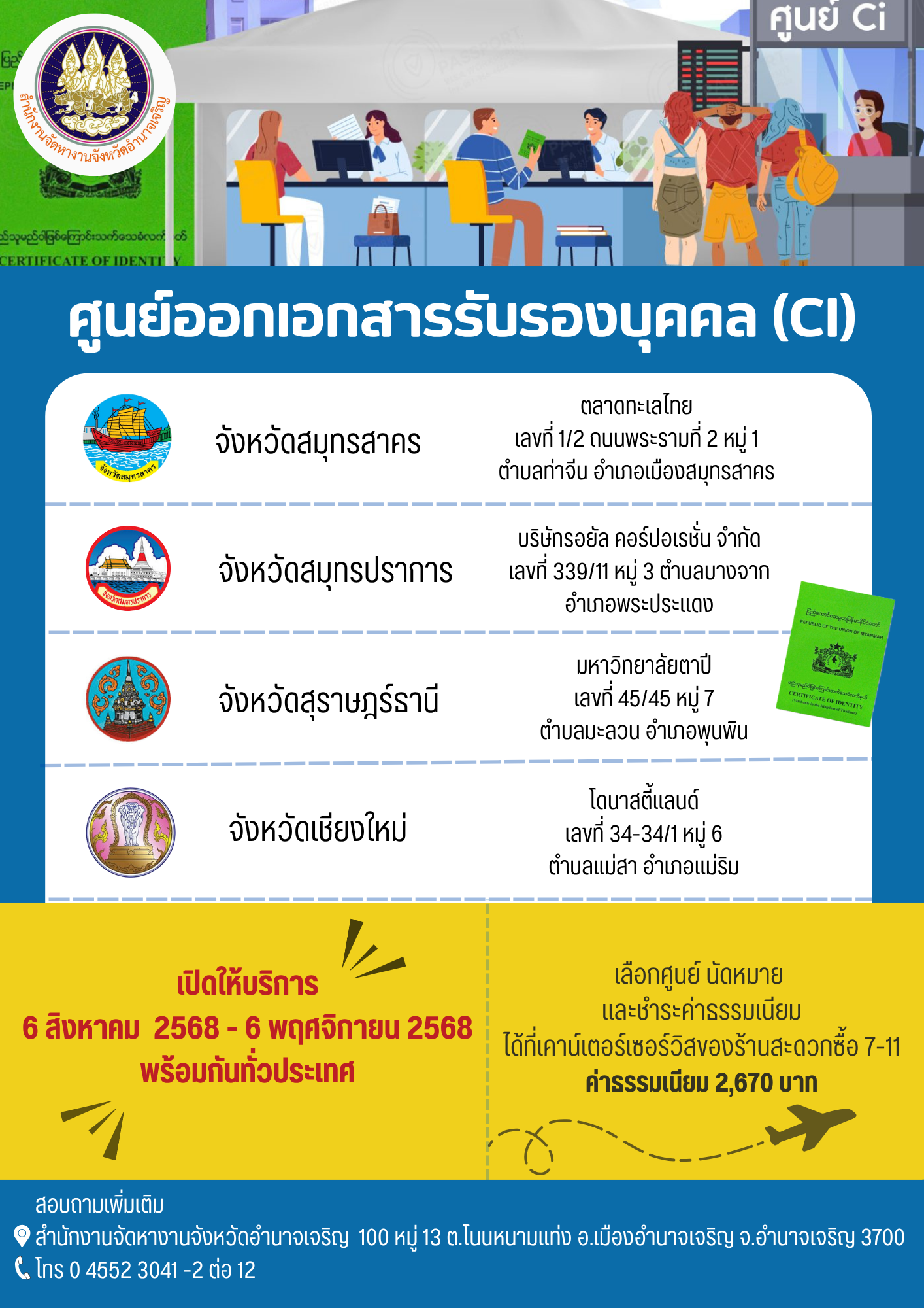 ประชาสัมพันธ์ "ศูนย์ออกเอกสารรับรองบุคคล (Certificate of Identity : CI) ของทางการเมียนมา เปิดให้บริการตั้งแต่วันที่ 6 สิงหาคม - 6 พฤศจิกายน 2568"