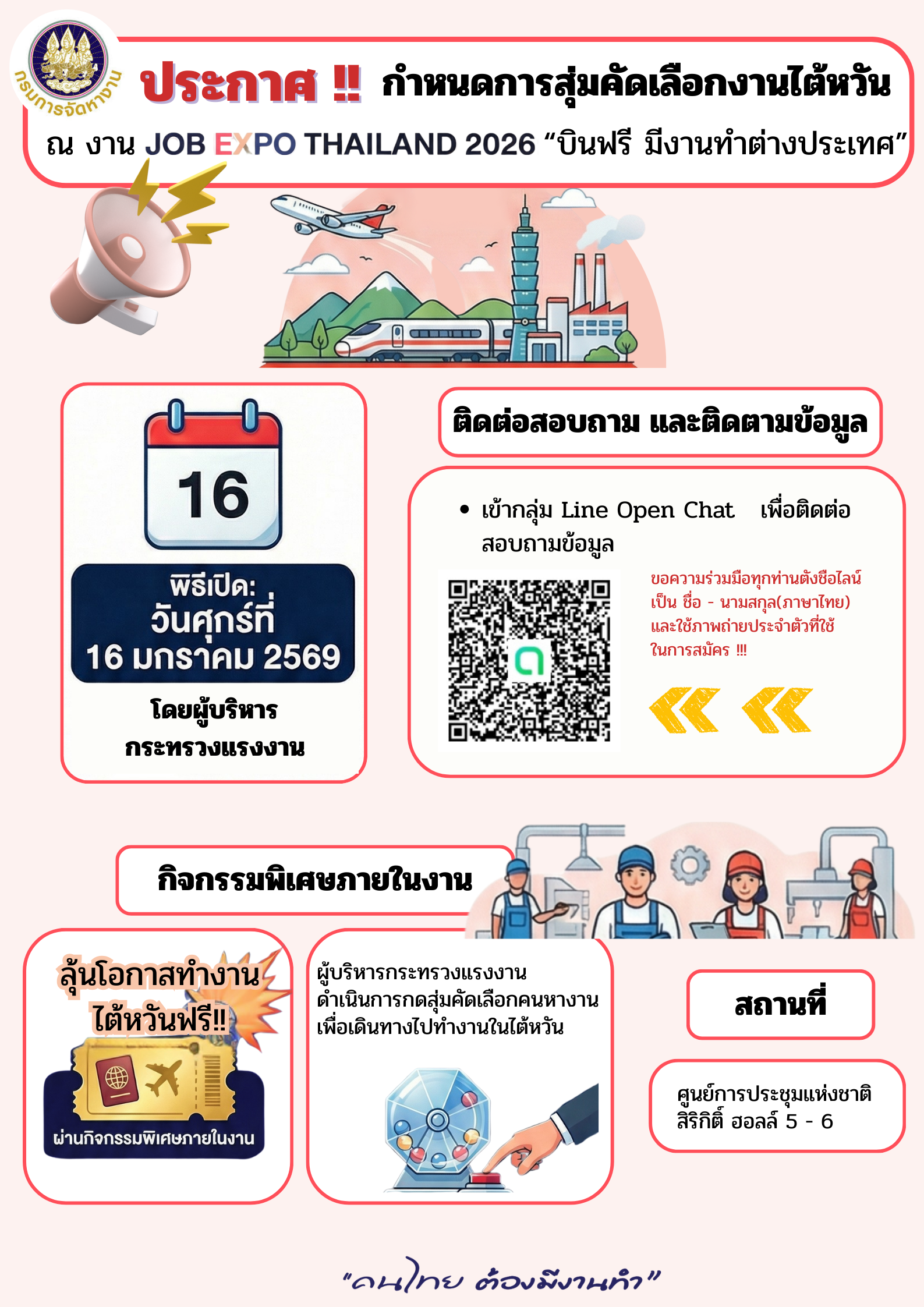 ประกาศ กำหนดการสุ่มคัดเลือกงานไต้หวัน ณ งาน JOB EXPO THAILAND 2026 บินฟรี มีงานทำต่างประเทศ