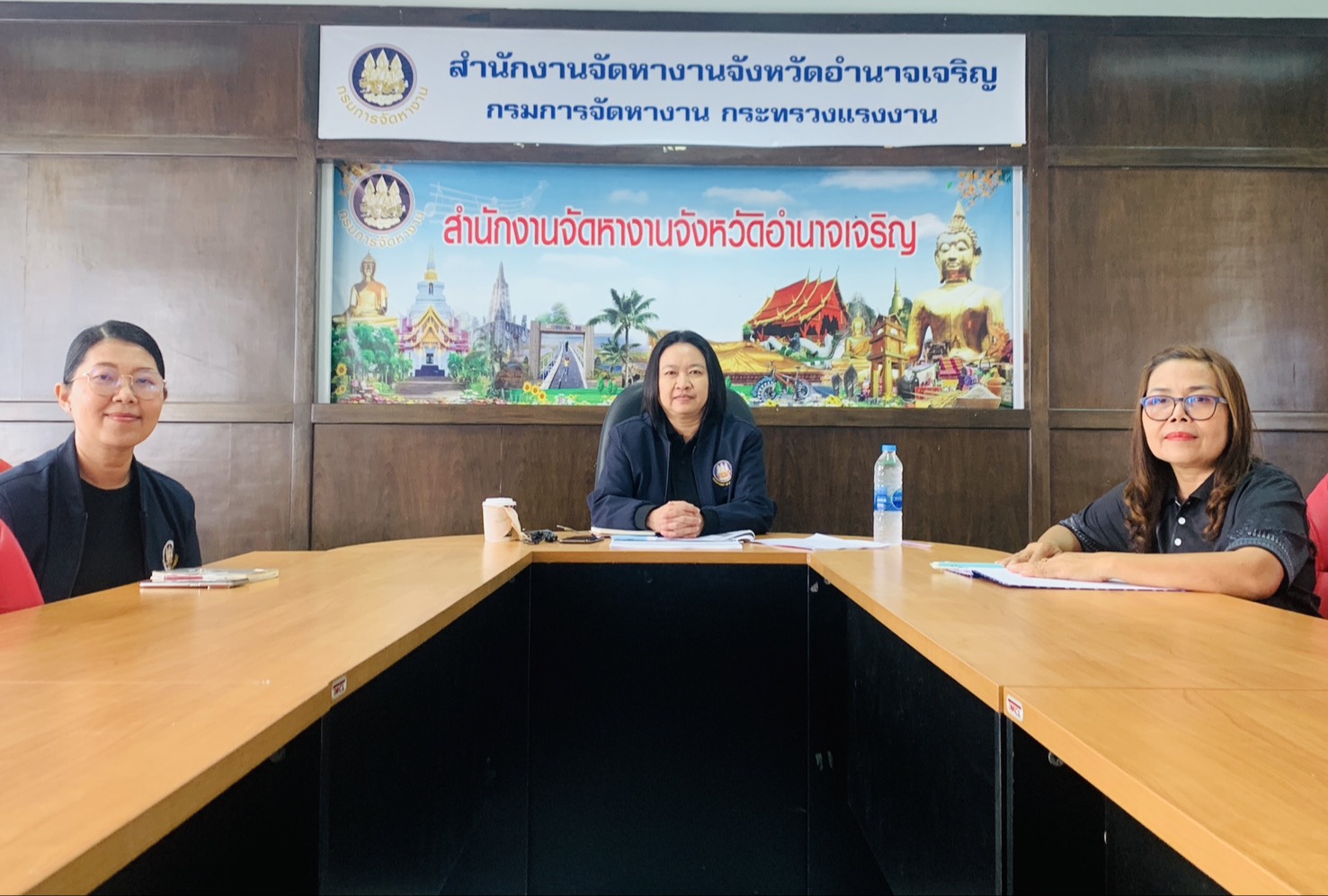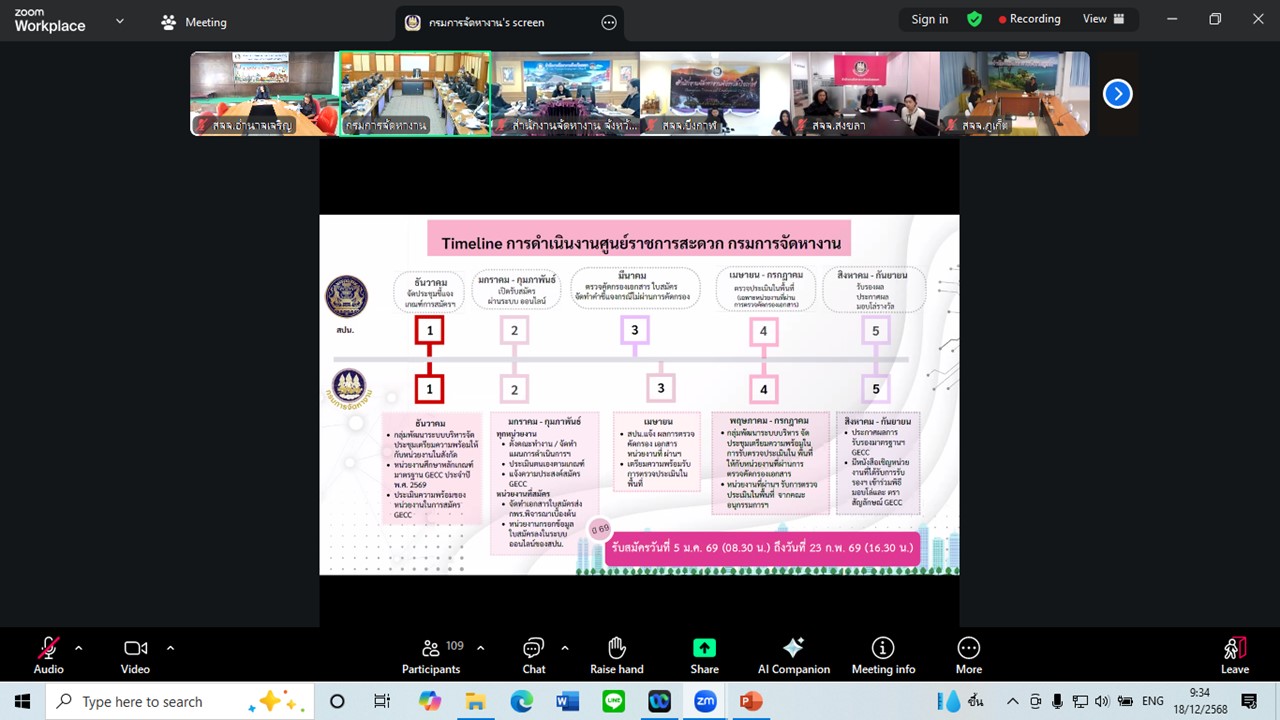 วันพฤหัสบดีที่ 18 ธันวาคม 2568 เวลา 08.30 น. นางสาวพอหทัย วงศ์สวัสดิ์ จัดหางานจังหวัดอำนาจเจริญ พร้อมเจ้าหน้าที่สำนักงานจัดหางานจังหวัดอำนาจเจริญ เข้าร่วมประชุมเตรียมความพร้อมเพื่อสมัครขอรับการรับรองมาตรฐานการให้บริการของศูนย์ราชการสะดวก (GECC) ประจำปี พ.ศ. 2569 ผ่านทางระบบวิดีทัศน์ทางไกล (Video Conference) ด้วยโปรแกรม Zoom Meeting ณ ห้องประชุมสำนักงานจัดหางานจังหวัดอำนาจเจริญ โดยมีนายสมชาย มรกตศรีวรรณ อธิบดีกรมการจัดหางาน เป็นประธานการประชุม