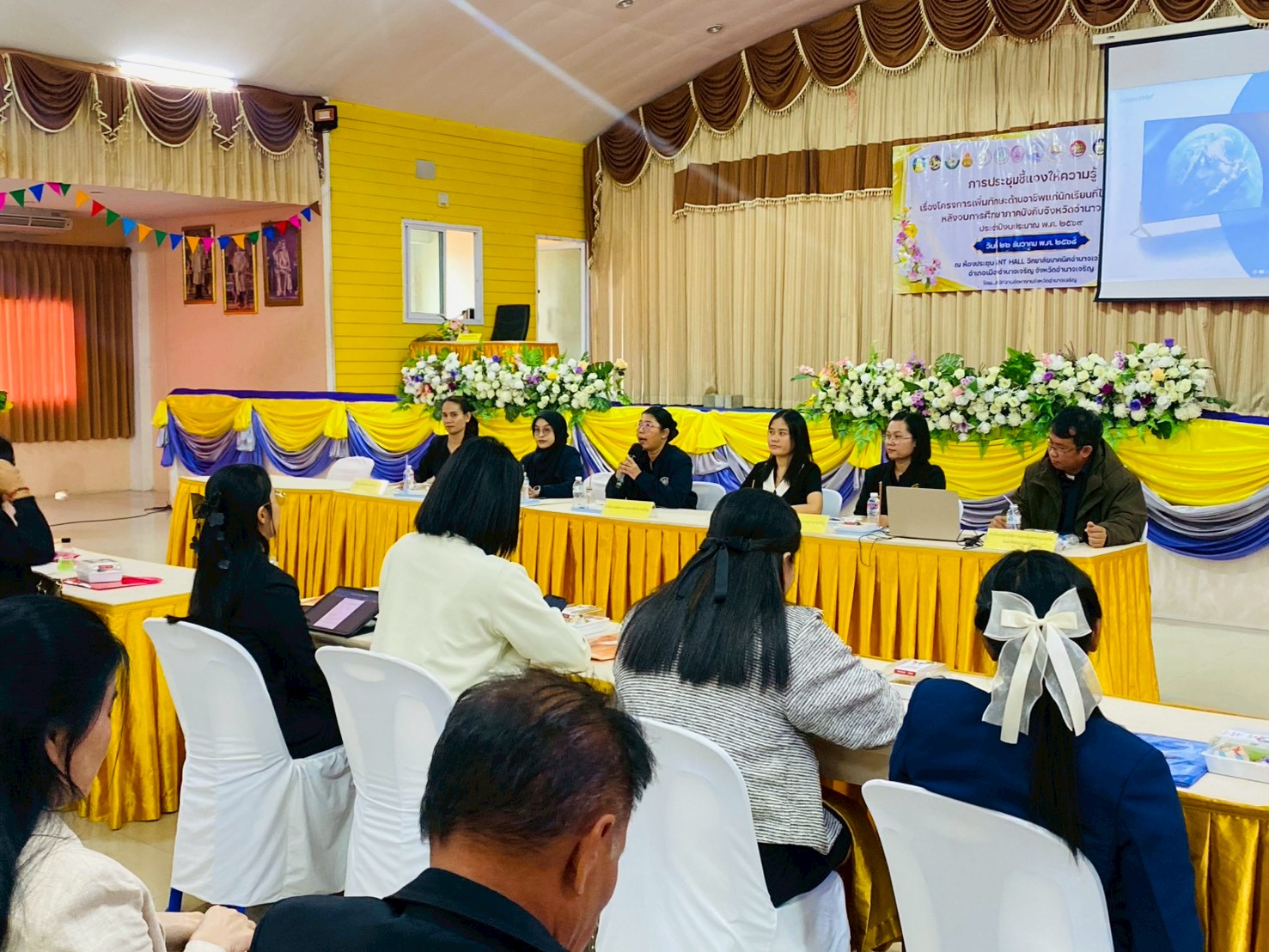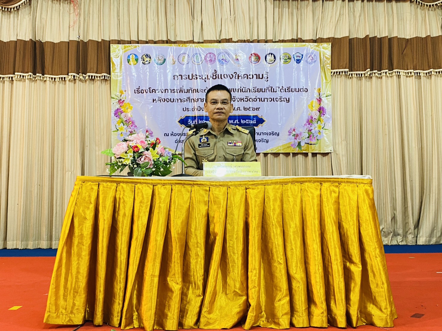 วันศุกร์ที่ 26 ธันวาคม 2568 นางสาวพอหทัย วงศ์สวัสดิ์ จัดหางานจังหวัดอำนาจเจริญ มอบหมายให้กลุ่มงานส่งเสริมการมีงานทำ สำนักงานจัดหางานจังหวัดอำนาจเจริญ ดำเนินกิจกรรมประชุมชี้แจงให้ความรู้เรื่องโครงการเพิ่มทักษะด้านอาชีพแก่นักเรียนที่ไม่ได้เรียนต่อหลังจบการศึกษาภาคบังคับ ภายใต้โครงการเตรียมความพร้อมแก่กลุ่มเป้าหมายก่อนเข้าสู่ตลาดแรงงาน ประจำปีงบประมาณ พ.ศ. 2569 ณ ห้องประชุม ANT HALL วิทยาลัยเทคนิคอำนาจเจริญ โดยมีผู้เข้าร่วมกิจกรรมประกอบด้วย ครูแนะแนว ผู้อำนวยการโรงเรียน บุคลากรทางการศึกษาที่ปฏิบัติงานด้านการแนะแนว และผู้นำท้องถิ่นรวมจำนวน 142 คน โดยมีนายไพฑูรย์ พรหมสอน รองผู้ว่าราชการจังหวัดอำนาจเจริญ เป็นประธานในพิธีเปิด