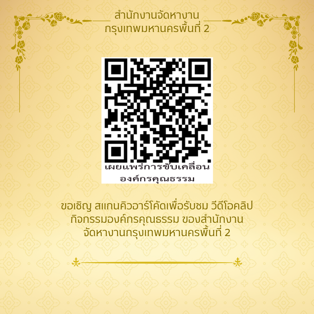 ขอเชิญสแกนคิวอาร์โค้ด รับชมวีดีโอคลิป เผยแพร่ กิจกรรมองค์กรคุณธรรมของสำนักงานจัดหางานกรุงเทพมหานครพื้นที่ 2