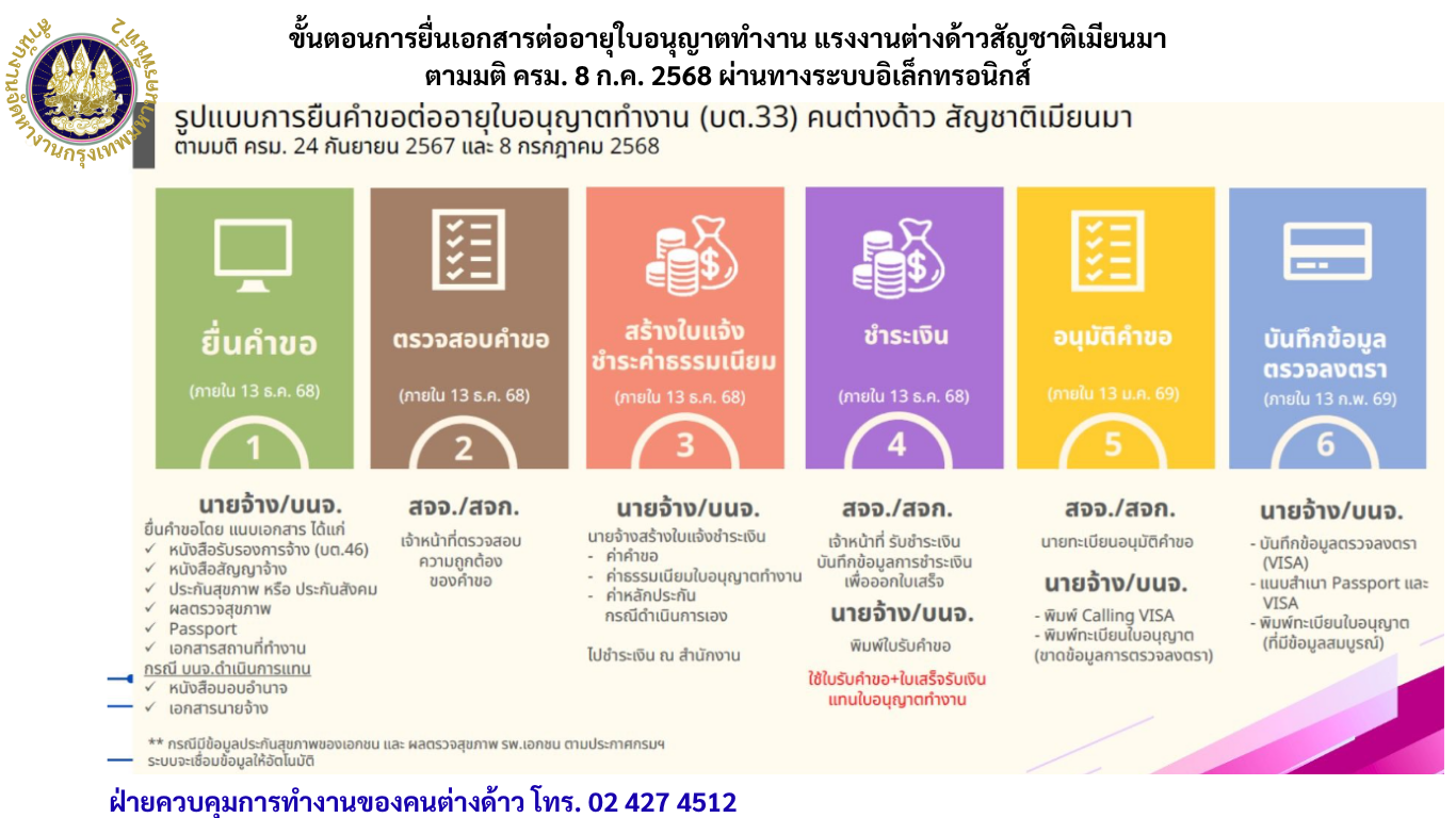 ขั้นตอนการยื่นเอกสารต่ออายุใบอนุญาตทำงาน แรงงานต่างด้าวสัญชาติเมียนมา ตามมติ ครม. 8 ก.ค. 2568 ผ่านทางระบบอิเล็กทรอนิกส์