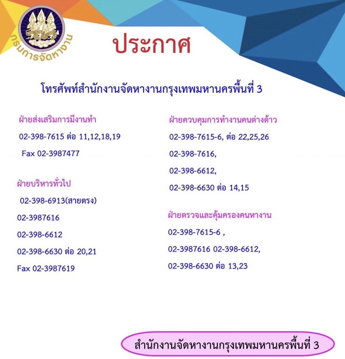 เบอร์โทรศัพท์ติดต่อ สำนักงานจัดหางานกรุงเทพมหานครพื้นที่ 3