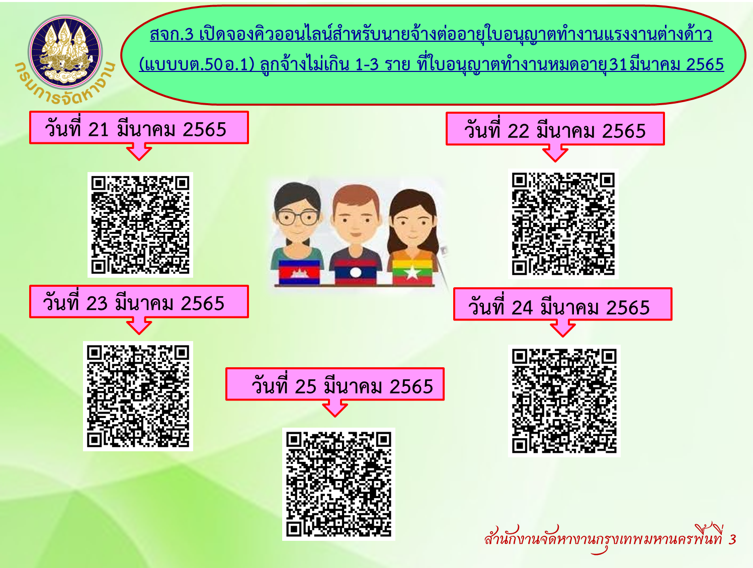 สจก.3 เปิดจองคิวออนไลน์สำหรับนายจ้างต่ออายุใบอนุญาตทำงานแรงงานต่างด้าว (แบบบต.50อ.1) ลูกจ้างไม่เกิน 1-3 ราย ที่ใบอนุญาตทำงานหมดอายุ31มีนาคม 2565