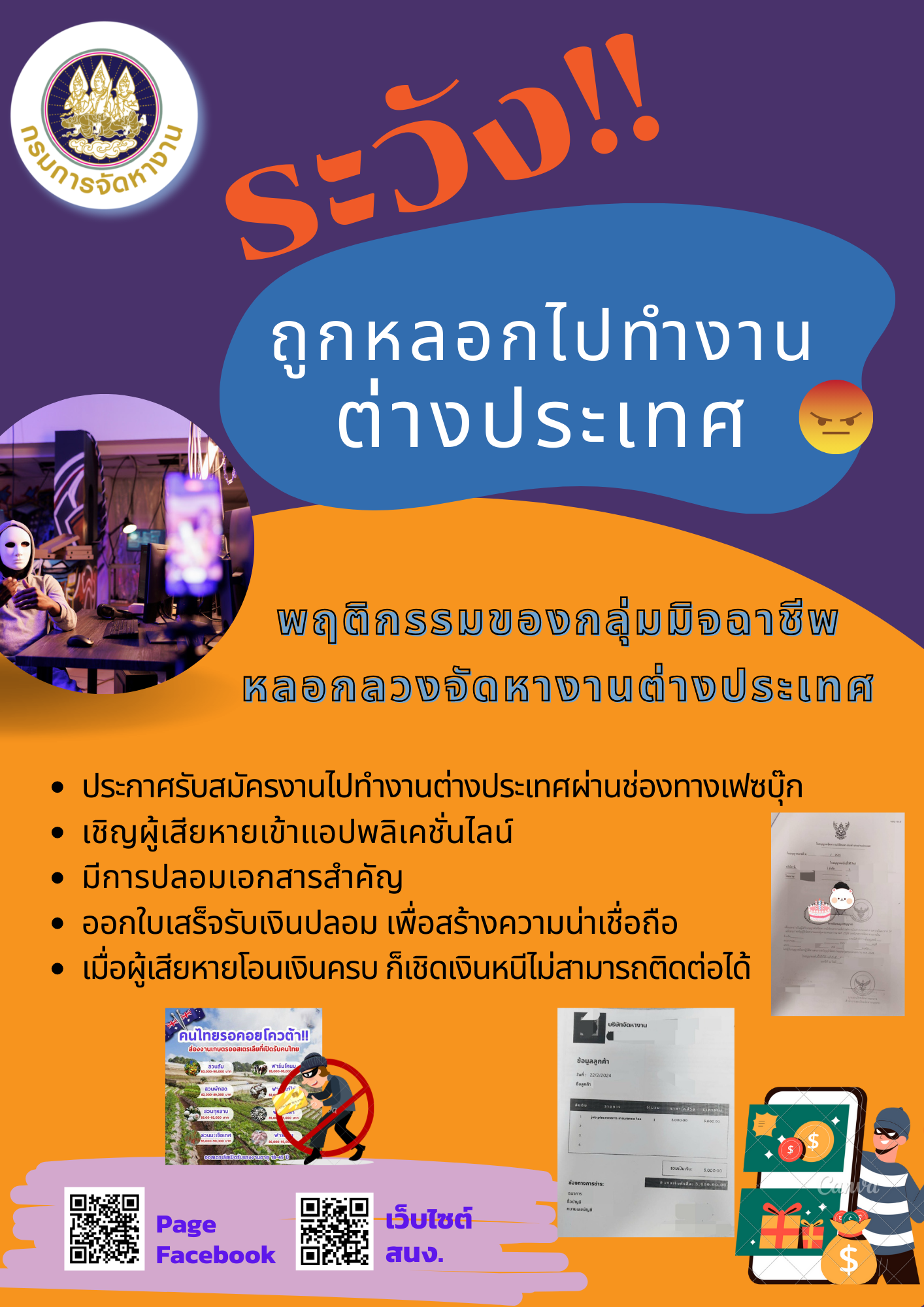 - ไม่ควรหลงเชื่อข้อความโฆษณาเชิญชวน ควรจะตรวจสอบข้อมูลกับกรมการจัดหางานก่อน