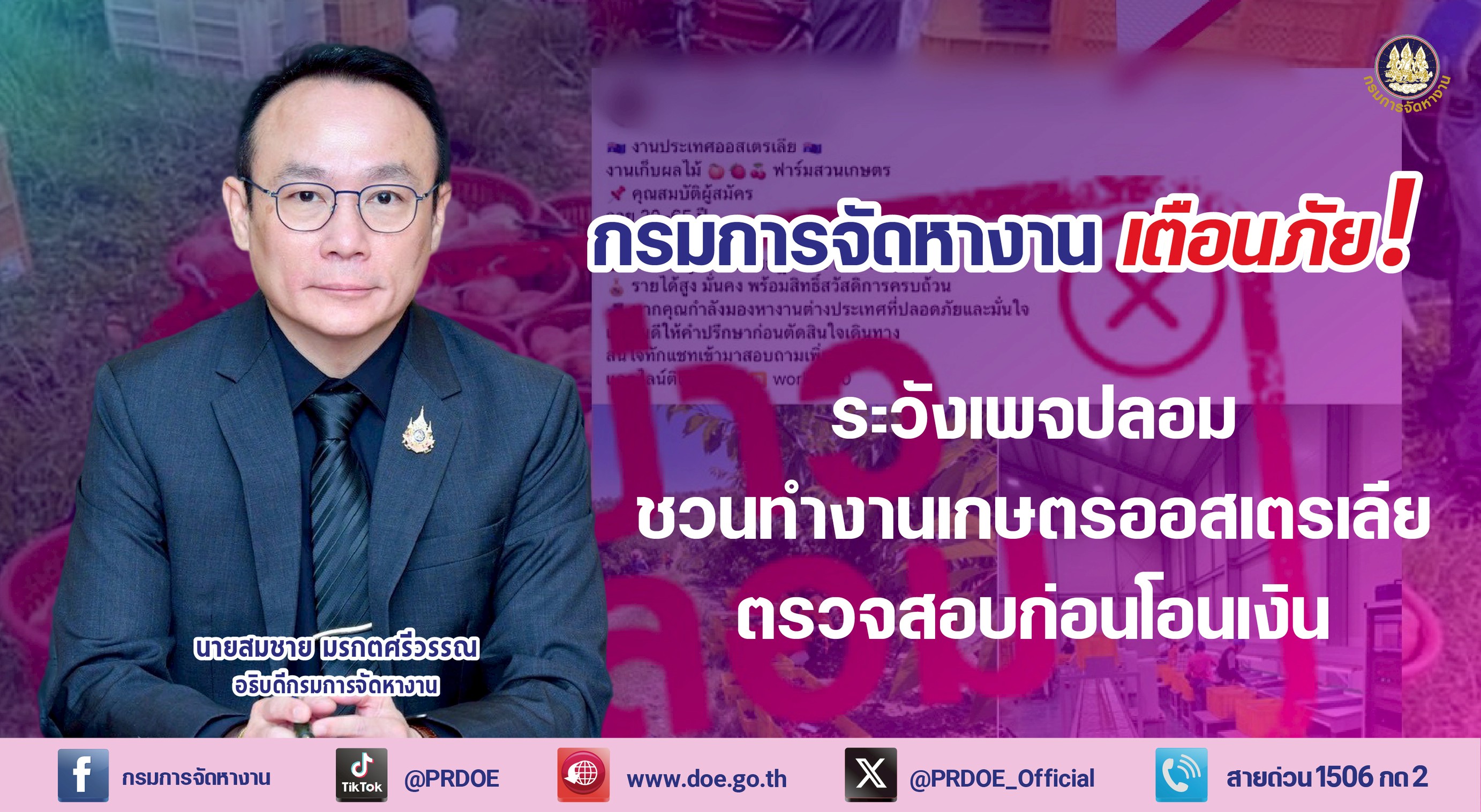 กรมการจัดหางาน เตือนภัยระวังเพจปลอมระบาดหนัก ชวนทำงานเกษตรออสเตรเลีย ย้ำตรวจสอบก่อนโอนเงิน RSS