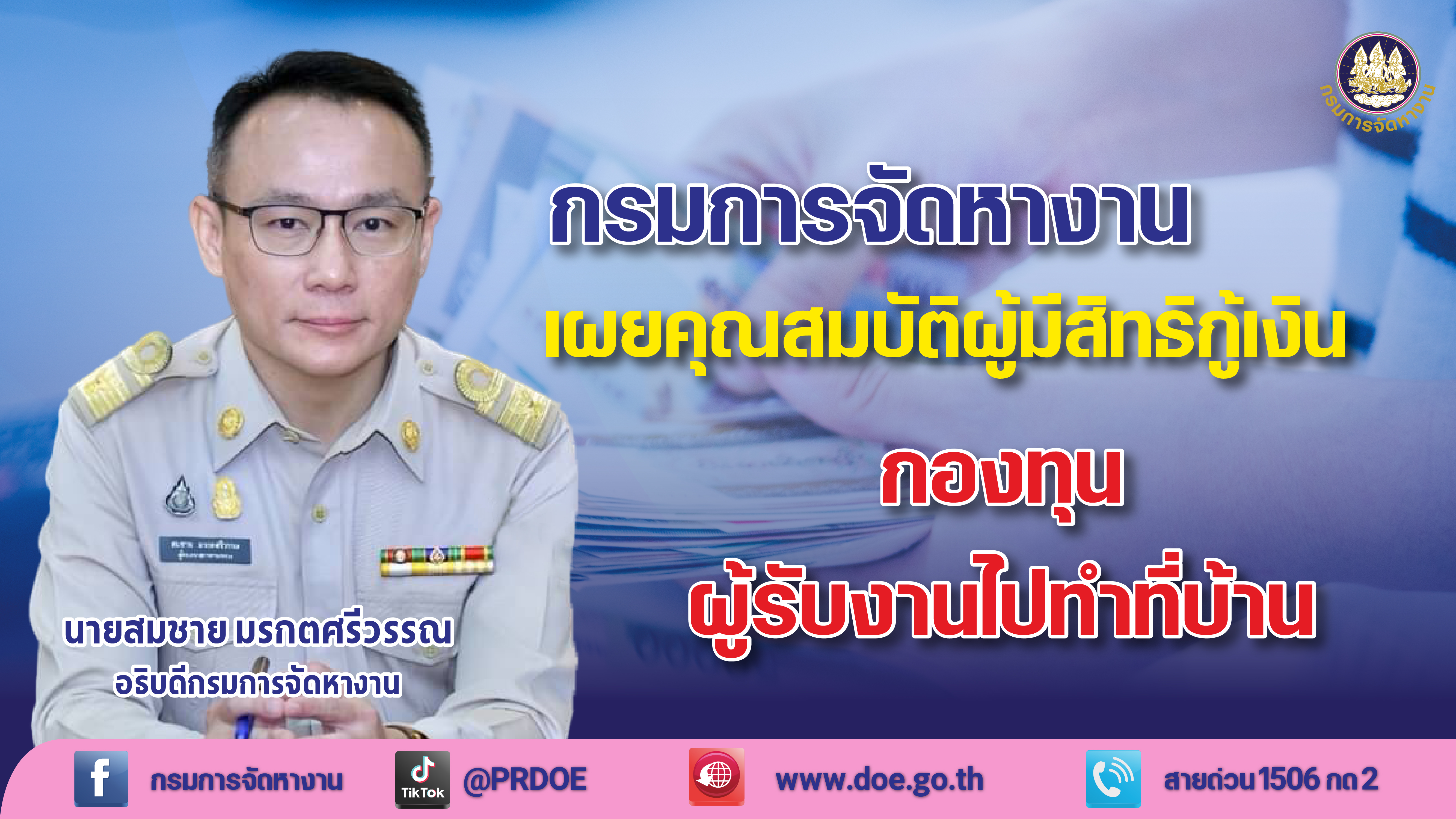 นายสมชาย มรกตศรีวรรณ อธิบดีกรมการจัดหางาน เปิดเผยว่า ขณะนี้มีผู้ให้ความสนใจกู้ยืมเงินกองทุนเพื่อผู้รับงานไปทำที่บ้านและสอบถามขอกู้ยืมเงินภายใต้เงื่อนไข ดอกเบี้ย 0% เข้ามาเป็นจำนวนมาก กรมการจัดหางานจึงขอประชาสัมพันธ์แนวทางการกู้ยืมเงินเพื่อให้ผู้รับงานไปทำที่บ้านซึ่งเป็นแรงงานอิสระสามารถกู้ยืมเป็นทุนหมุนเวียนสำหรับไปซื้อวัตถุดิบและอุปกรณ์ในการผลิตหรือขยายการผลิต เพื่อสร้างอาชีพ สร้างรายได้ให้กับผู้รับงานไปทำที่บ้าน ซึ่งผู้ที่ต้องการขึ้นทะเบียนเป็นผู้รับงานไปทำที่บ้านต้องมีสัญชาติไทย อายุ 20 ปีขึ้นไป มีสถานที่ที่รับงานไปทำที่บ้านเป็นหลักแหล่ง กรณีเป็นกลุ่มบุคคลต้องมีสมาชิกกลุ่มไม่น้อยกว่า 5 คน (มีผู้นำกลุ่ม) และต้องไม่เป็นสมาชิกกลุ่มผู้รับงานฯกลุ่มอื่น โดยสามารถเตรียมเอกสารหลักฐานสำเนาบัตรประจำตัวประชาชน ติดต่อได้ที่สำนักงานจัดหางานจังหวัดทั่วประเทศ