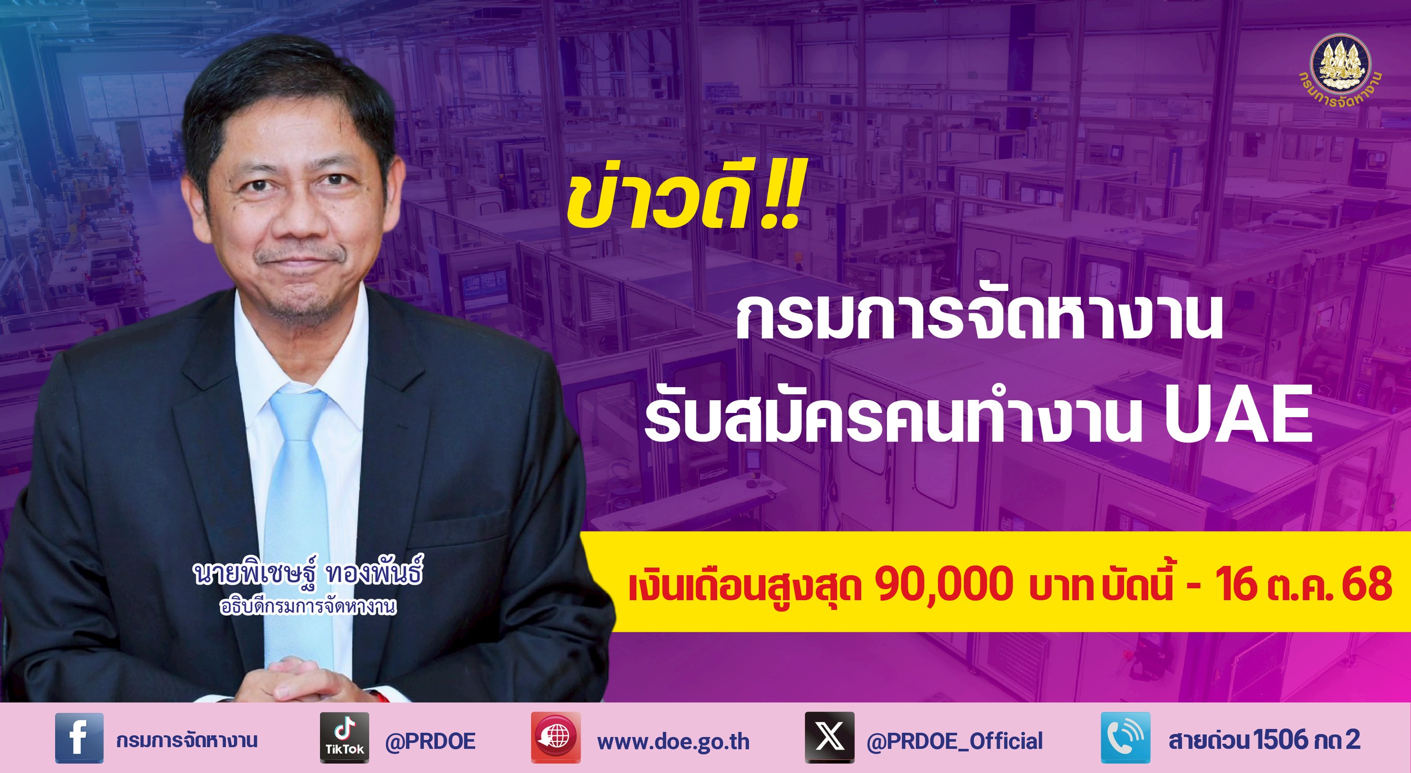 นายพิเชษฐ์ ทองพันธ์ อธิบดีกรมการจัดหางาน เปิดเผยว่า กรมการจัดหางาน เปิดรับสมัครคนหางานเพื่อไปทำงานในสหรัฐอาหรับเอมิเรตส์ กับนายจ้างบริษัท CROWN Emirates Company Ltd. สหรัฐอาหรับเอมิเรตส์ ซึ่งประกอบกิจการผลิตกระป๋องและผลิตภัณฑ์อลูมิเนียม จำนวน 6 ตำแหน่ง 17 อัตรา ได้แก่ หัวหน้างาน วิศวกรรม/การผลิต/เครื่องกล ช่างไฟฟ้า ช่างกล พนักงานควบคุมเครื่องจักร/ช่างเครื่อง และพนักงานฝ่ายผลิต เงินเดือนอยู่ระหว่าง 17,100 – 90,000 บาท (ขึ้นอยู่อัตราแลกเปลี่ยน) ระยะเวลาสัญญาจ้าง 2 ปี มีค่าล่วงเวลาตามกฎหมายยูเออี โดยนายจ้างจะจัดหาที่พัก อาหารวันละ 3 มื้อ พร้อมจ่ายค่าโดยสารเครื่องบินไป - กลับ เมื่อทำงานครบตามสัญญาจ้าง และความคุ้มครองประกันภัย ผู้สนใจสามารถศึกษารายละเอียดเพิ่มเติมและยื่นใบสมัครได้ที่เว็ปไซต์ toea.doe.go.th ได้ตั้งแต่บัดนี้ถึง 16 ตุลาคม 2568 ตลอด 24 ชั่วโมง ไม่เว้นวันหยุดราชการ