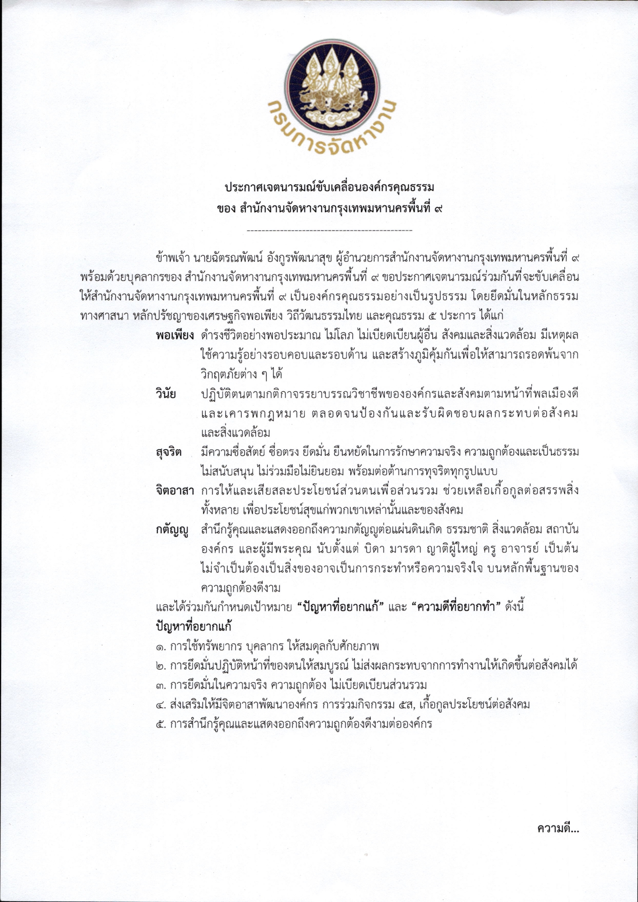 ประกาศเจตนารมณ์ขับเคลื่อนองค์กรคุณธรรม ประจำปี 2569