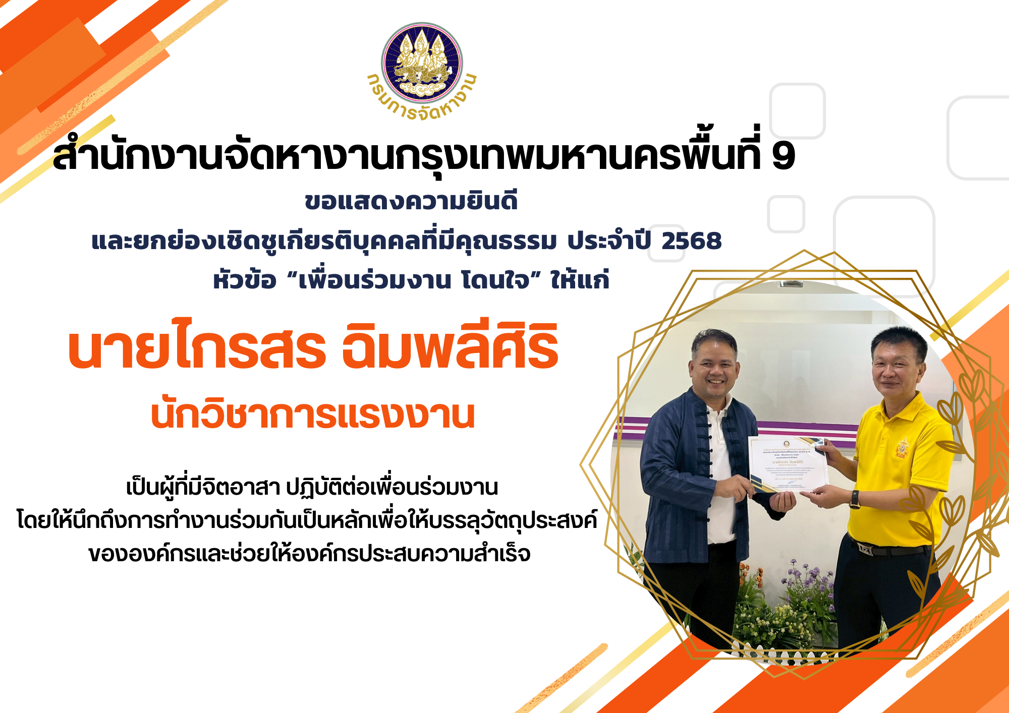 วันที่ 23 พฤษภาคม พ.ศ. 2568 สำนักงานจัดหางานกรุงเทพมหานครพื้นที่9 ได้ประกาศยกย่องเชิดชูบุคลากรที่มีคุณธรรมหรือทำความดีจนเป็นที่ประจักษ์ ประจำปี 2568 หัวข้อ“เพื่อนร่วมงาน โดนใจ” ให้แก่ นายไกรสร ฉิมพลีศิริ นักวิชาการแรงงาน ซึ่งเป็นผู้มีจิตอาสา ปฏิบัติต่อเพื่อนร่วมงาน โดยนึกถึงการทำงานร่วมกันเป็นหลักเพื่อให้บรรลุวัตถุประสงค์ขององค์กรและช่วยให้องค์กรประสบความสำเร็จ
