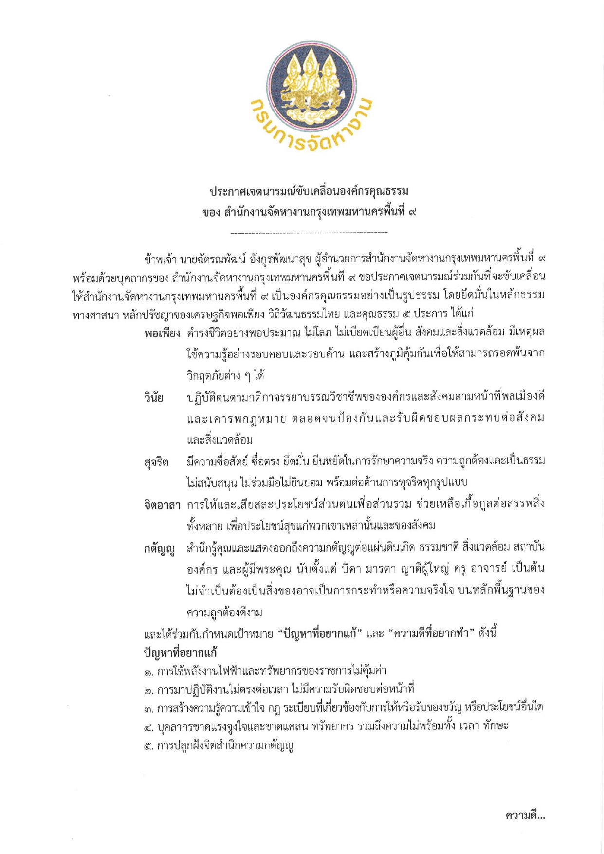 ประกาศเจตนารมณ์ขับเคลื่อนองค์กรคุณธรรม ประจำปี 2568