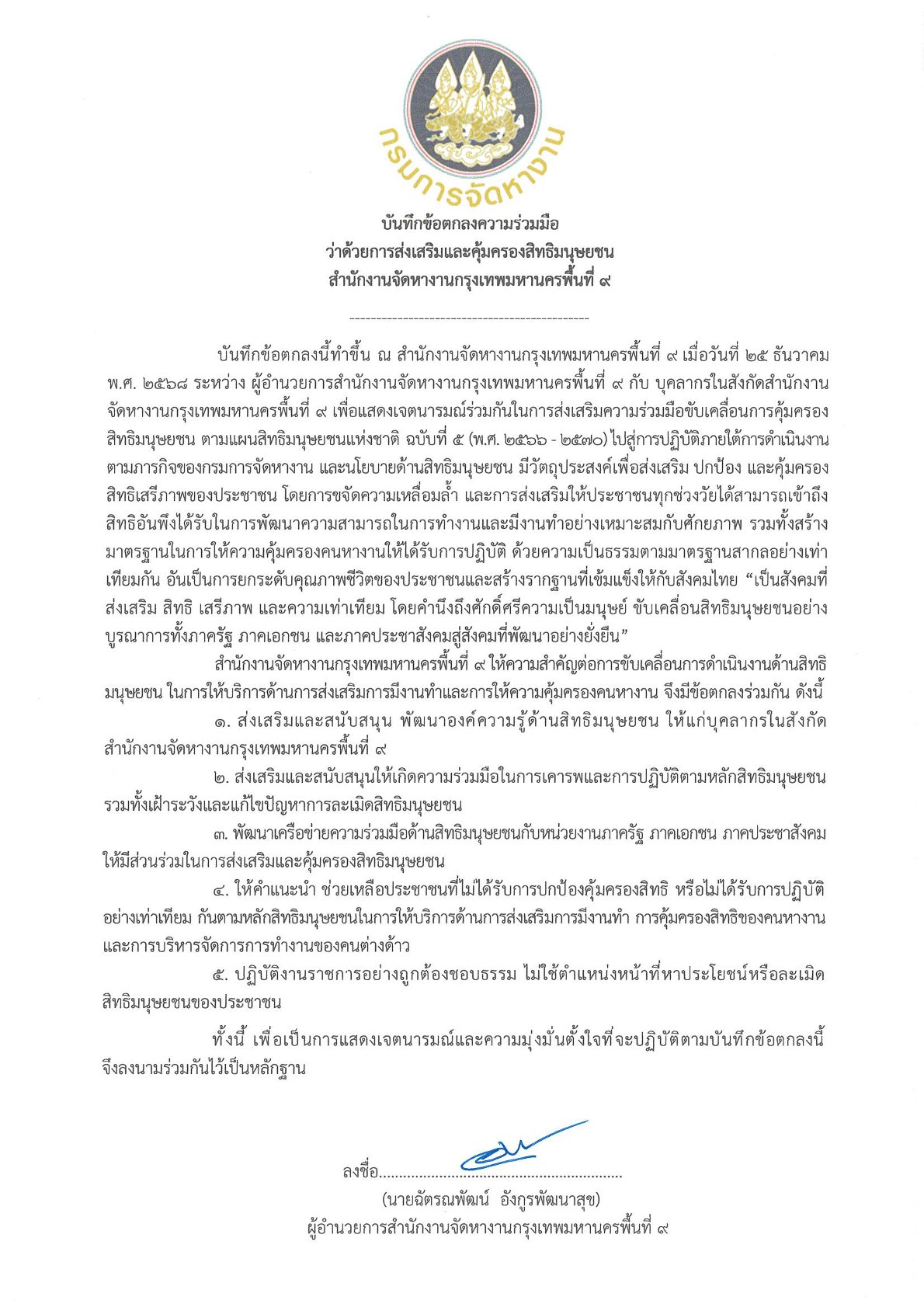 บันทึกข้อตกลงความร่วมมือว่าด้วยการส่งเสริมและคุ้มครองสิทธิมนุษยชน สำนักงานจัดหางานกรุงเทพมหานครพื้นที่ ๙ เมือ่วันที่ 25 ธันวาคม 2568