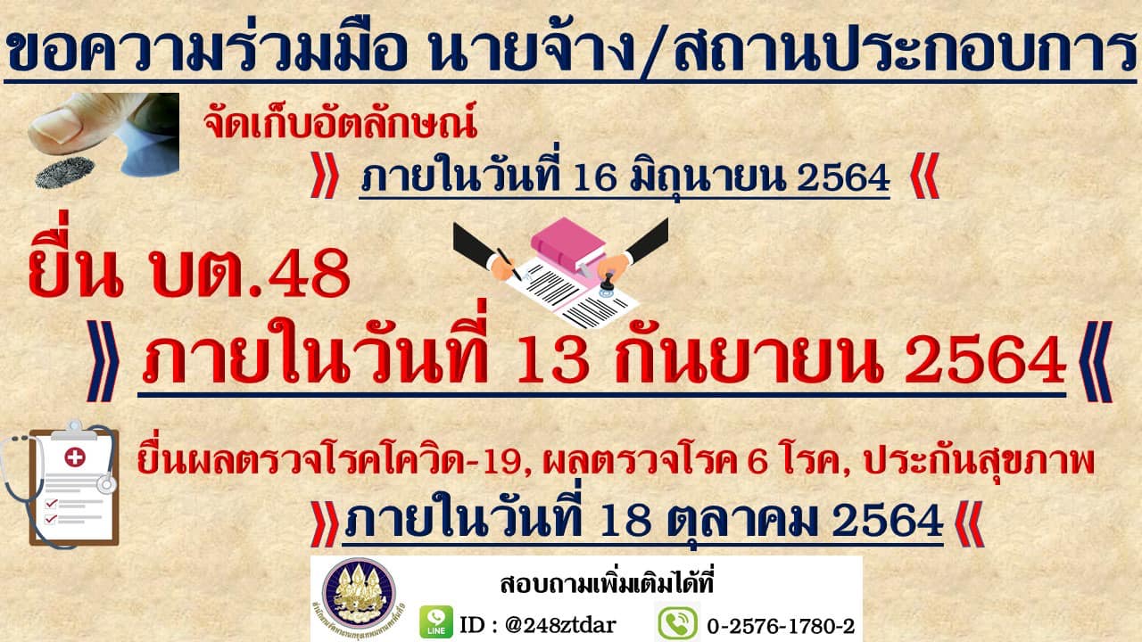 ขอความร่วมมือนายจ้าง/สถานประกอบการ ** รีบยื่น บต.48 ภายในวันที่ 13 กันยายน 2564 **
