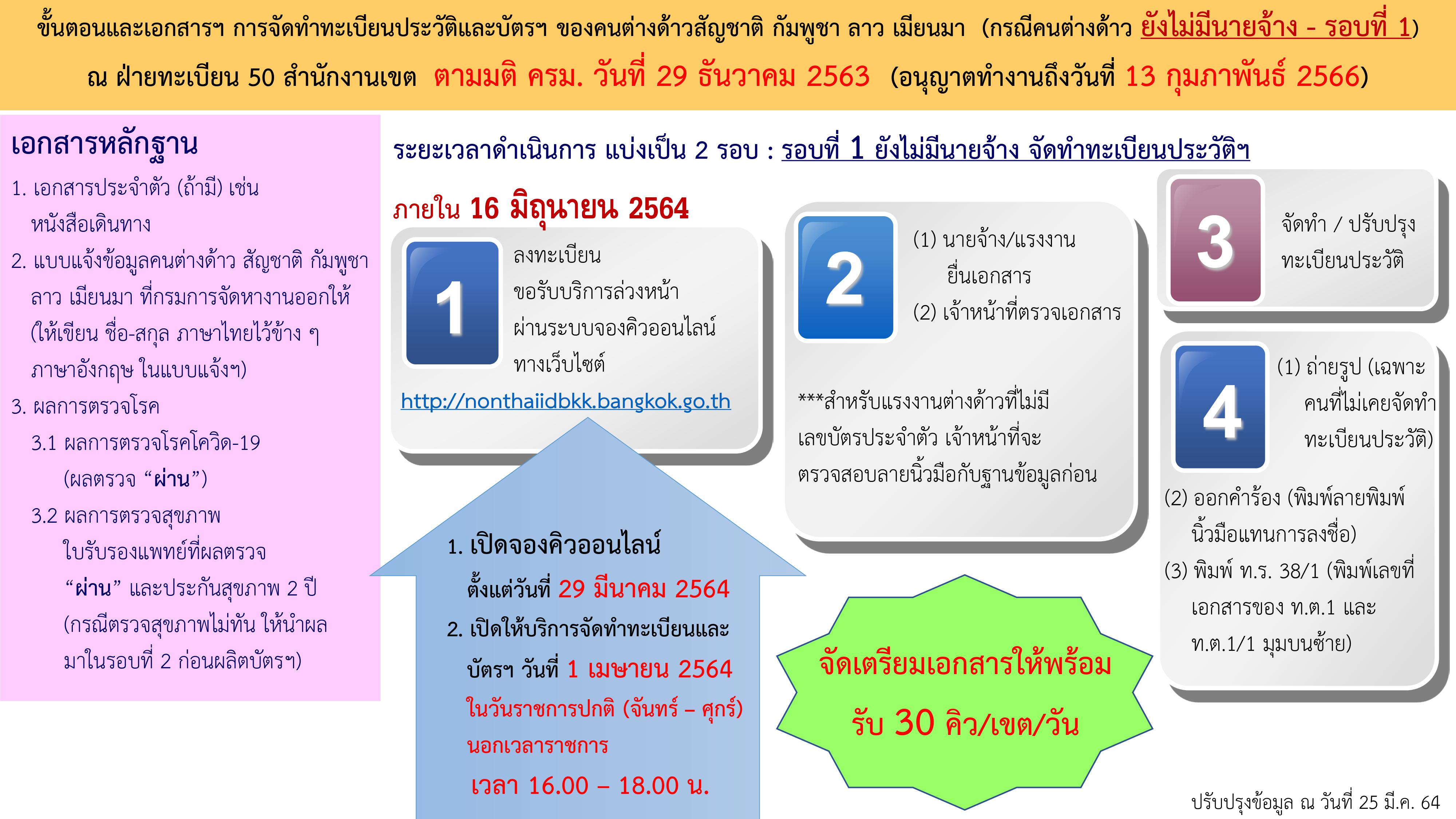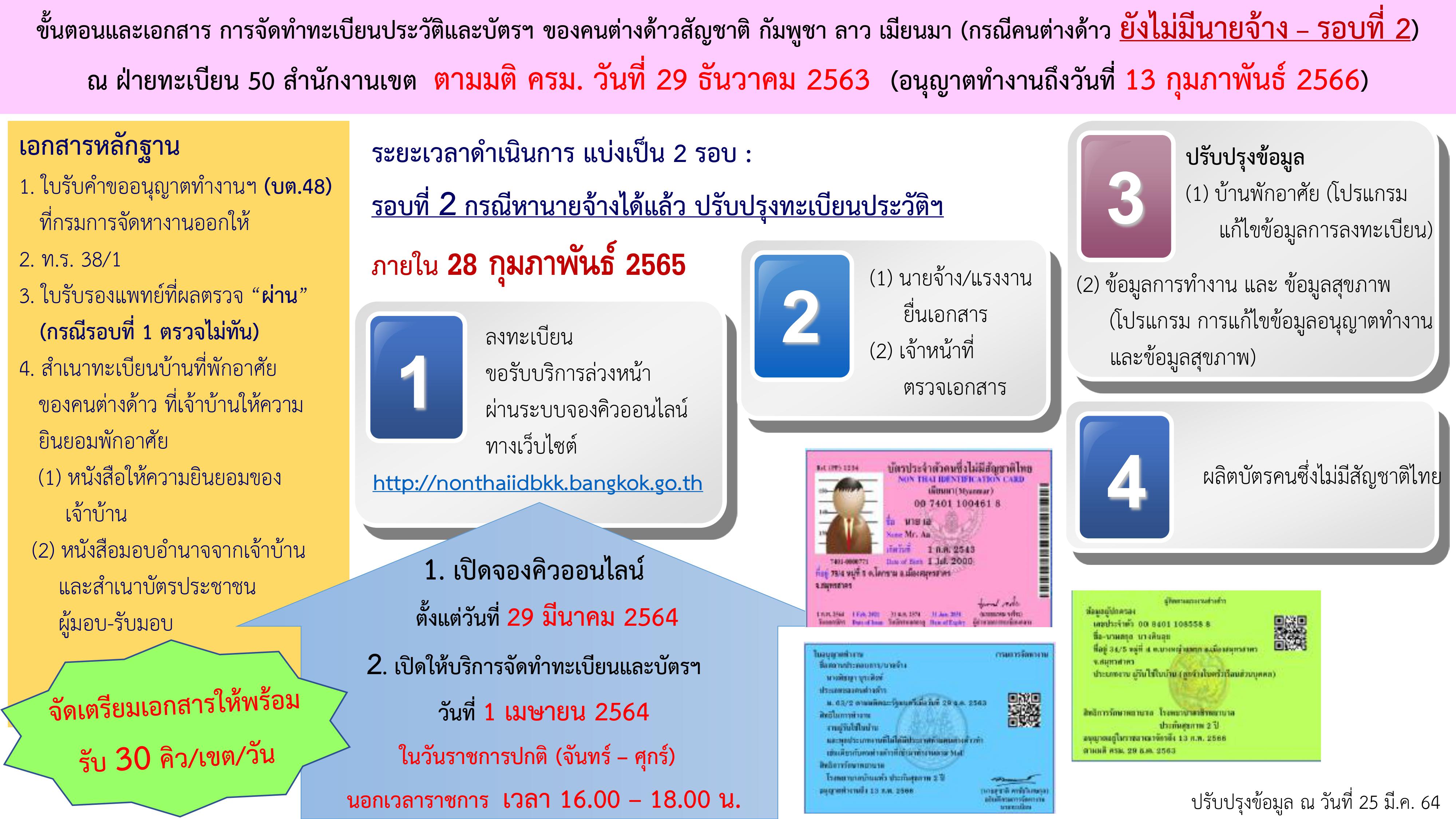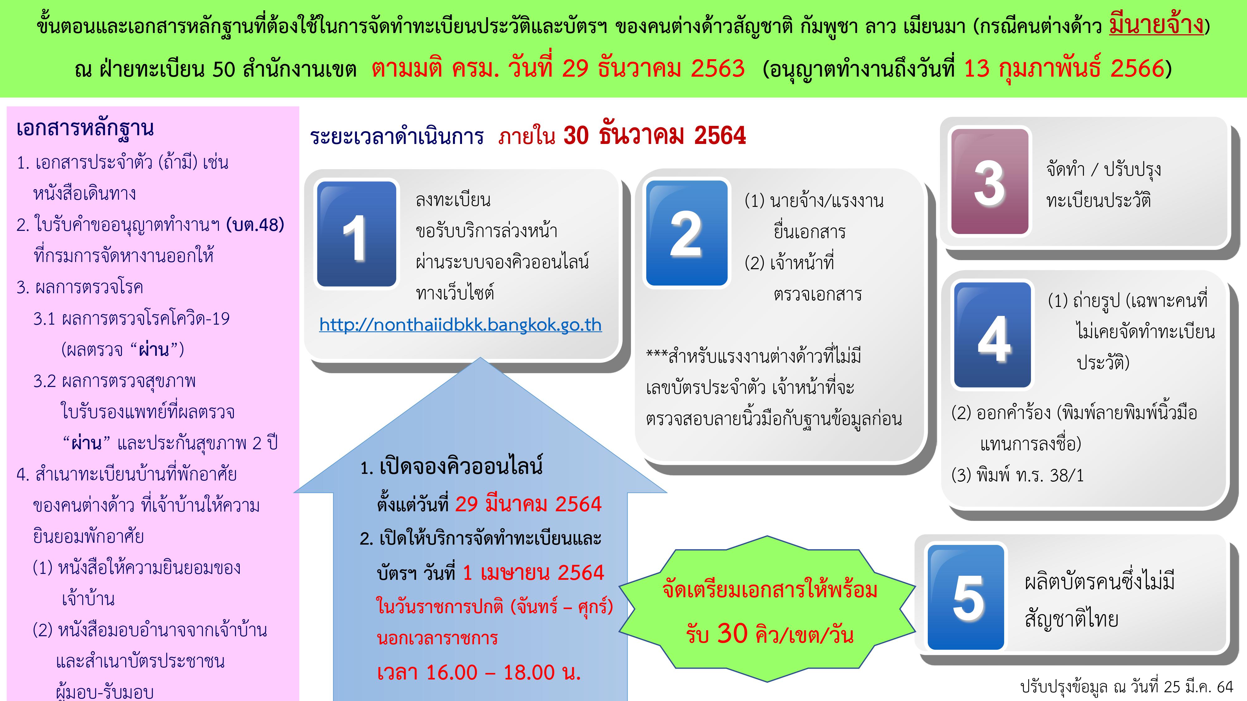 ขั้นตอนและเอกสารหลักฐานที่ต้องใช้ในการจัดทำทะเบียนประวัติและบัตรฯ ของคนต่างด้าวสัญชาติ กัมพูชา ลาว เมียนมา ณ ฝ่ายทะเบียน 50 สำนักงานเขต