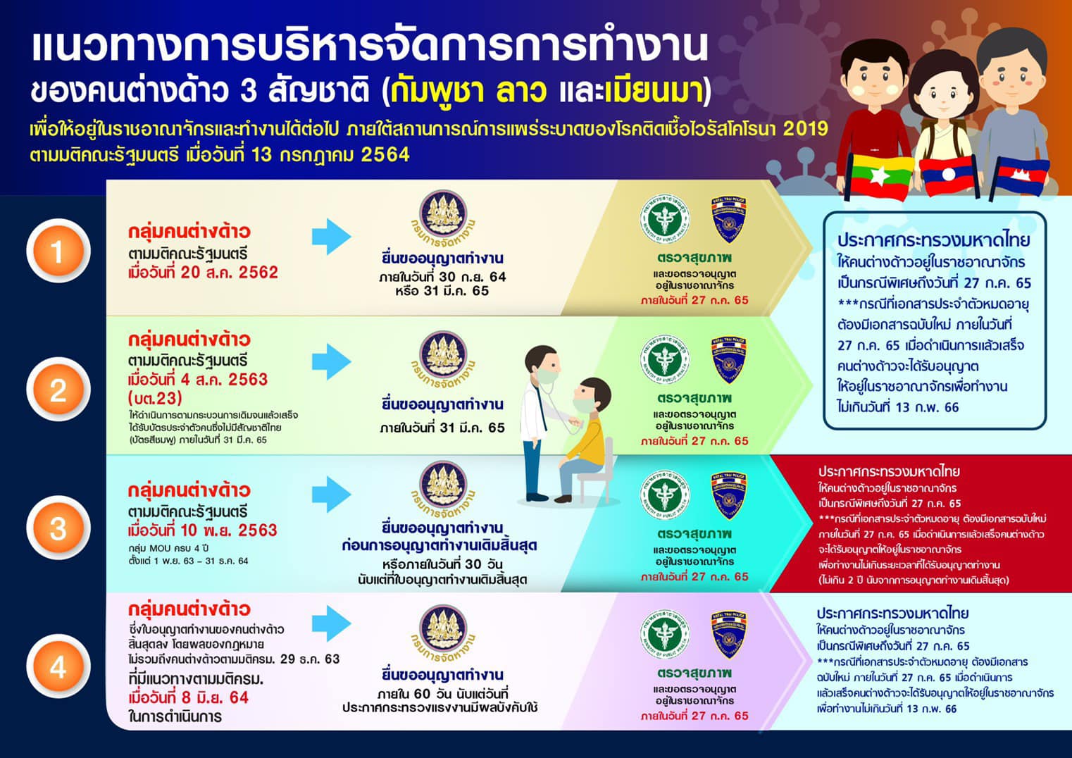 แนวทางการบริหารจัดการการทำงานของคนต่างด้าว 3 สัญชาติ ภายใต้สถานการณ์แพร่ระบาดของโรคติดเชื้อไวรัสโคโรนา COVID-19 ตามมติ ครม. 13 ก.ค. 2564