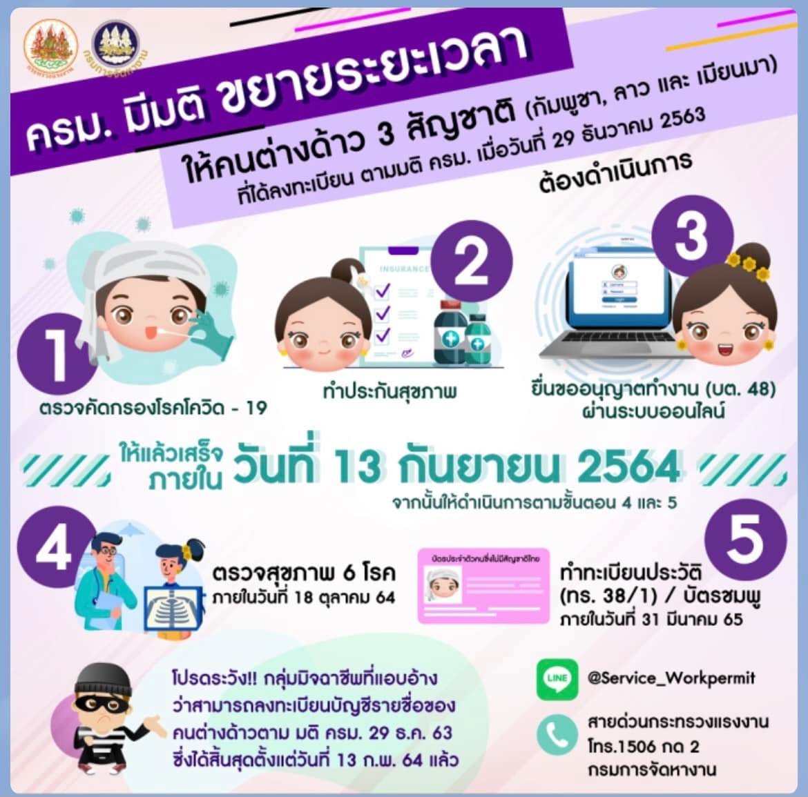 กรมการจัดหางานขอความร่วมมือนายจ้าง/สถานประกอบการ นำคนต่างด้าวกลุ่มมติ ครม. วันที่ 29 ธันวาคม 2563 เข้ารับการตรวจหาเชื้อไวรัสโคโรนา 2019 (โควิด-19) พร้อมทำประกันสุขภาพ และยื่นขออนุญาตทำงาน (บต.48) ผ่านระบบออนไลน์ https://e-workpermit.doe.go.th/ ภายในวันที่ 13 กันยายน 2564