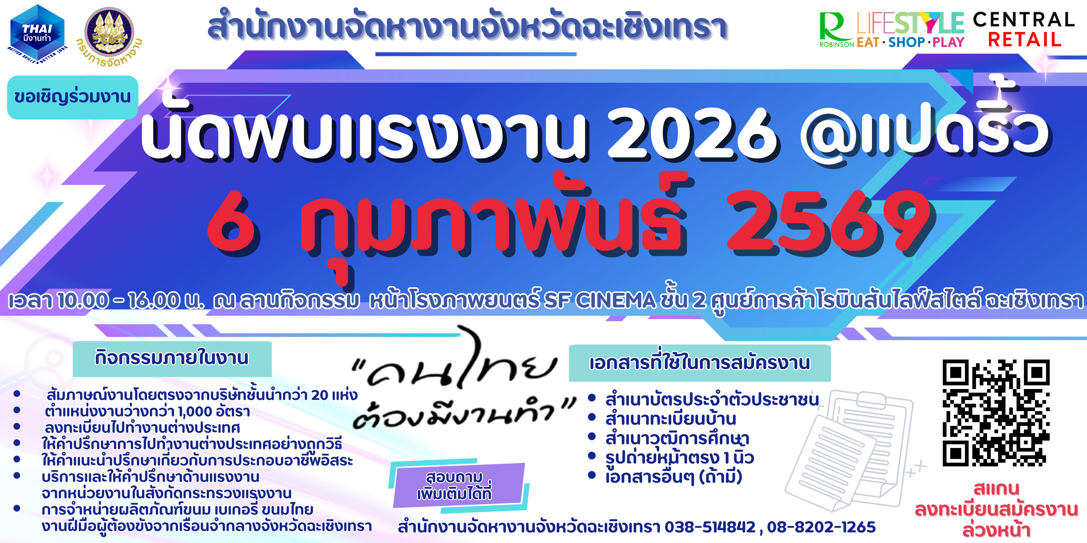 สำนักงานจัดหางานจังหวัดฉะเชิงเทรา ขอเชิญร่วมงาน “นัดพบแรงงาน 2026 @แปดริ้ว” ในวันพุธที่ 6 กุมภาพันธ์ 2569 เวลา 10.00 – 16.00 น. ณ ลานกิจกรรม หน้าโรงภาพยนตร์ SF CINEMA ชั้น 2 ศูนย์การค้าโรบินสันไลฟ์สไตล์ ฉะเชิงเทรา