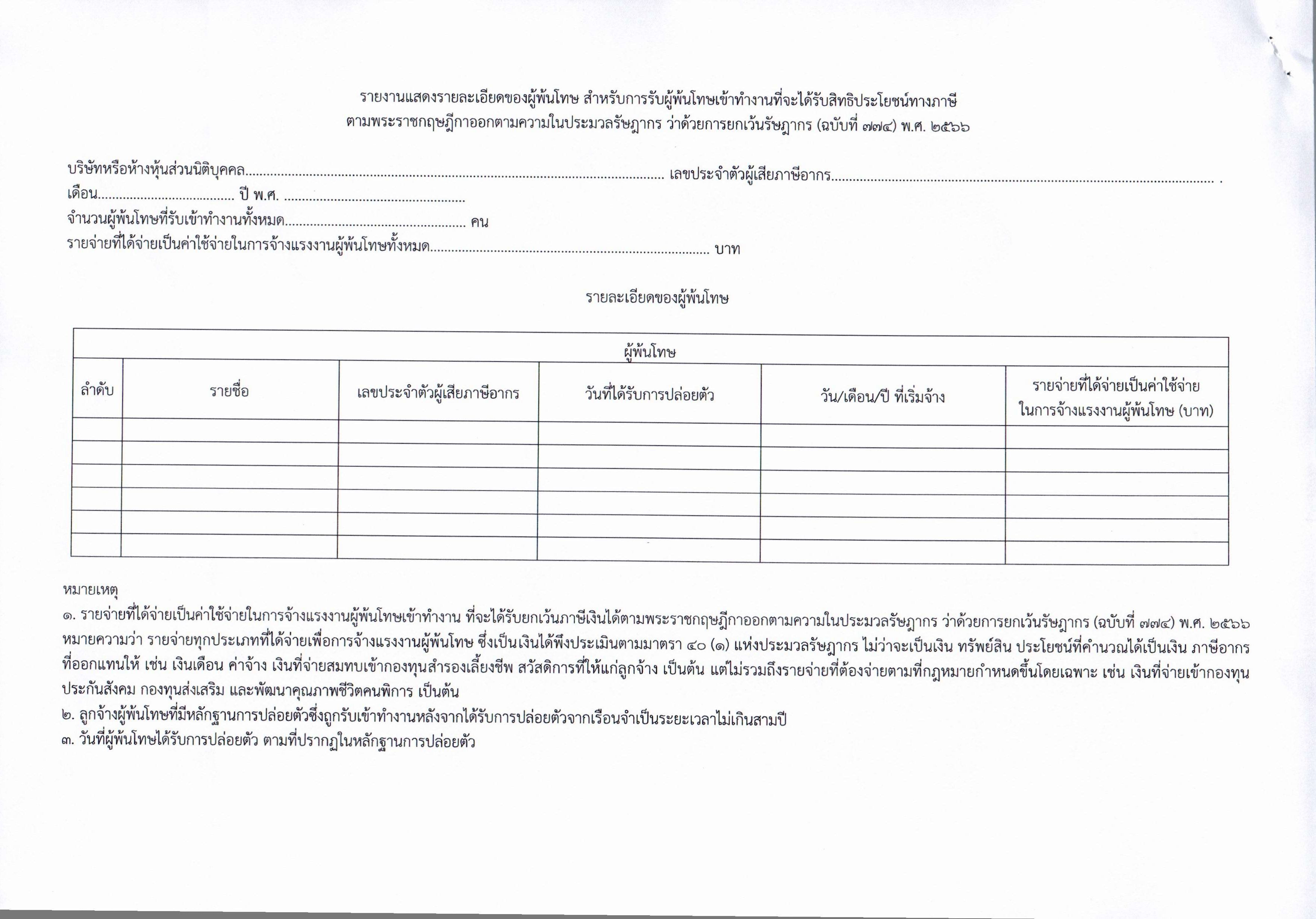 2.จัดทำรายงานเกี่ยวกับการรับผู้พ้นโทษเข้าทำงานที่จะนำมาใช้สิทธิยกเว้นภาษีเงินได้ สำหรับรายจ่ายที่ได้จ่ายเป็นค่าใช้จ่ายในการจ้างแรงงานผู้พ้นโทษ เป็นรายเดือน ซึ่งมีรายการและข้อความอย่างน้อยตามแบบที่แนบท้ายประกาศนี้ และเก็บรักษารายงานดังกล่าว รวมทั้งเอกสารประกอบการลงรายการในรายงานไว้ ณ สถานประกอบการ พร้อมที่จะให้พนักงานประเมินตรวจสอบได้