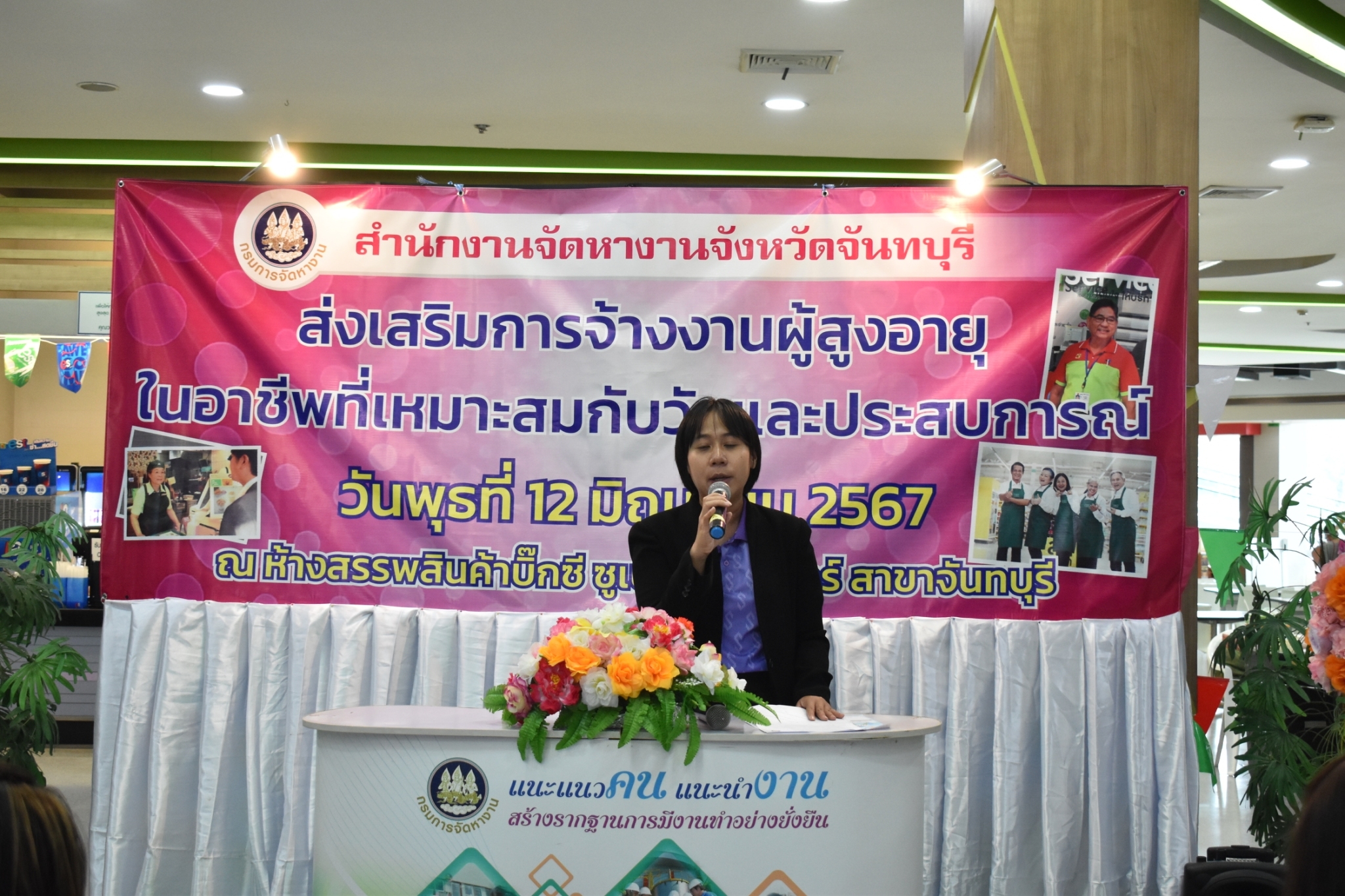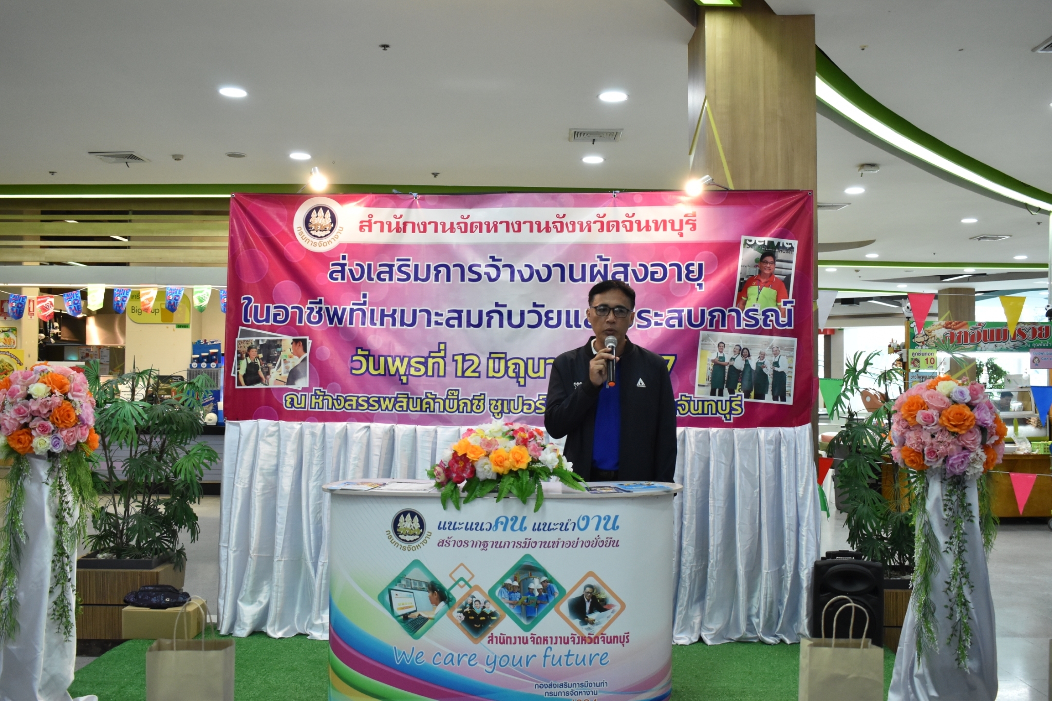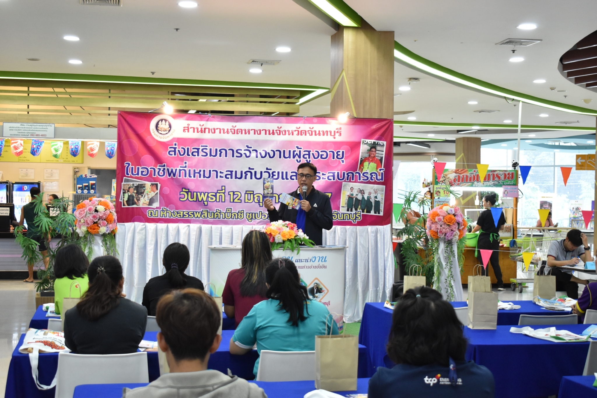วันที่ 12 มิถุนายน 2567 สำนักงานจัดหางานจังหวัดจันทบุรี ดำเนินโครงการขยายโอกาสการมีงานทำ ให้ผู้สูงอายุ กิจกรรมส่งเสริมการจ้างงานผู้สูงอายุในอาชีพที่เหมาะสมกับวัยและประสบการณ์ เพื่อสร้างการรับรู้ สร้างความเข้าใจในมาตรการและสิทธิประโยชน์ต่างๆ แก่นายจ้าง/สถานประกอบการ ในการจ้างงานที่เหมาะสมสำหรับผู้สูงอายุ จำนวน 14 แห่ง ณ ห้างสรรพสินค้าบิ๊กซี ซูเปอร์เซ็นเตอร์ สาขาจันทบุรี ต.ตลาด อ.เมืองจันทบุรี จ.จันทบุรี