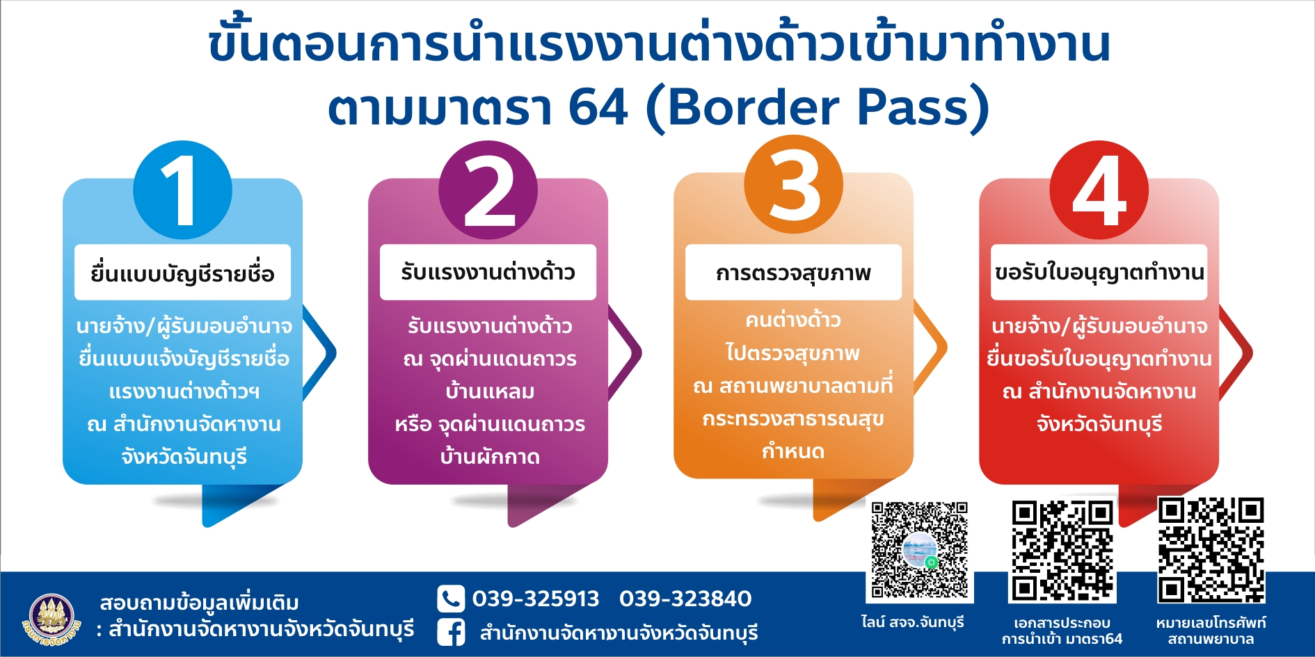 นางสาวอนงค์นุช มีศิริ จัดหางานจังหวัดจันทบุรี เปิดเผยว่า จังหวัดจันทบุรีเป็นจังหวัดที่มีพื้นที่ส่วนใหญ่ทําเกษตรกรรม ประชากรส่วนใหญ่ประกอบอาชีพในภาคเกษตร โดยเฉพาะทำสวนผลไม้ ซึ่งผลไม้ที่เป็นพืชเศรษฐกิจได้แก่ ทุเรียน ลำไย มังคุด สำหรับการเก็บผลผลิตส่วนใหญ่ใช้แรงงานต่างด้าวสัญชาติกัมพูชา เนื่องจากมีอาณาเขตด้านทิศตะวันออกติดต่อกับกัมพูชา ในพื้นที่ อ.สอยดาวและ อ.โป่งน้ำร้อน มีพื้นที่ติดกับจังหวัดพระตะบองและจังหวัดไพลินของกัมพูชา โดยเป็นการเข้ามาทำงานโดยมีบัตรผ่านแดน (Border Pass) เพื่อการทำงานในลักษณะไป-กลับหรือตามฤดูกาล ในพื้นที่ความตกลงว่าด้วยการข้ามแดนระหว่างไทยกับกัมพูชา ตามมาตรา 64 แห่งพระราชกำหนดการบริหารจัดการการทำงานของคนต่างด้าว พ.ศ.2560 แก้ไขเพิ่มเติม (ฉบับที่ 2) พ.ศ.2561 ทั้งนี้ การนำแรงงานต่างด้าวเข้ามาทำงาน ตามมาตรา 64 มี 4 ขั้นตอนคือ