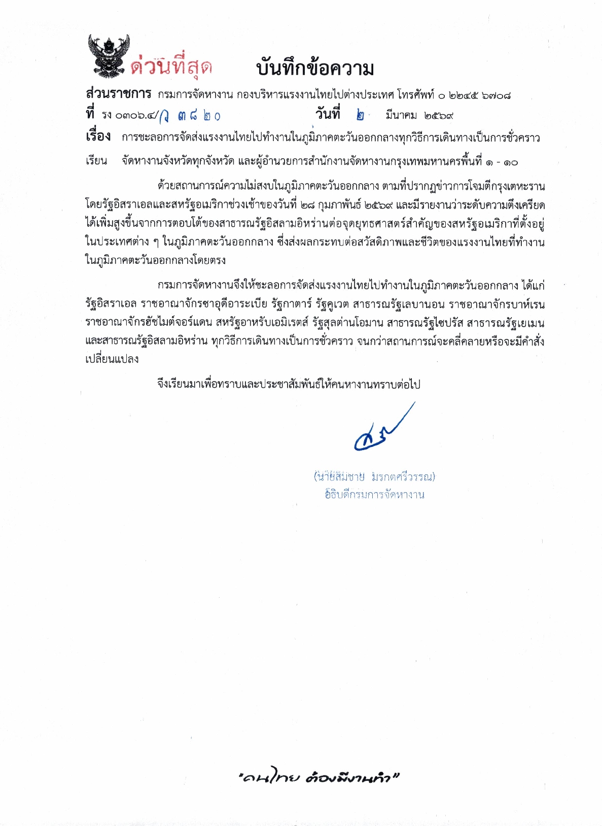การชะลอการจัดส่งแรงงานไทยไปทำงานในภูมิภาคตะวันออกกลางทุกวิธีการเดินทางเป็นการชั่วคราว