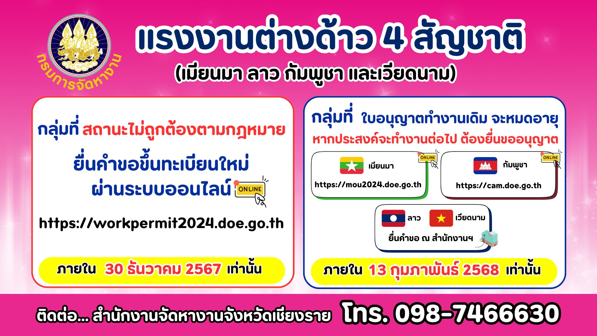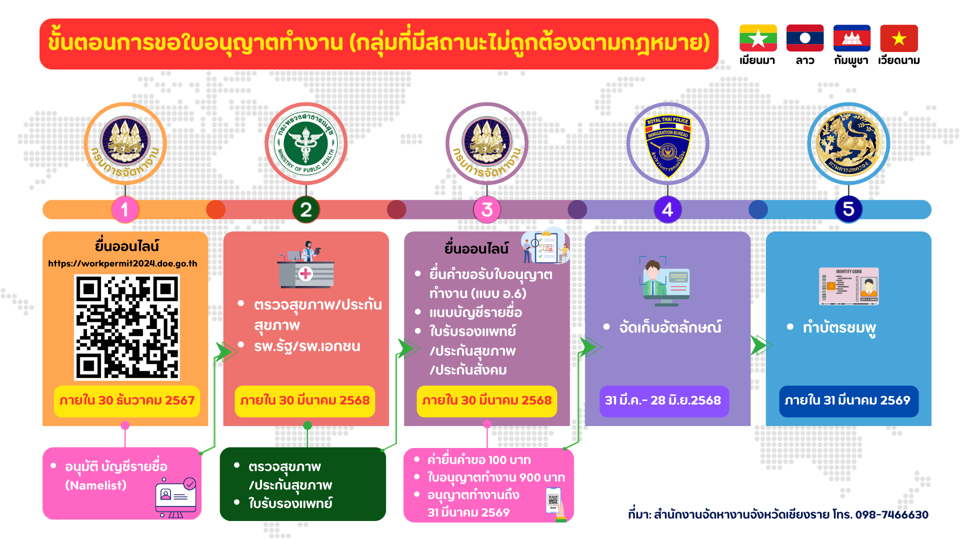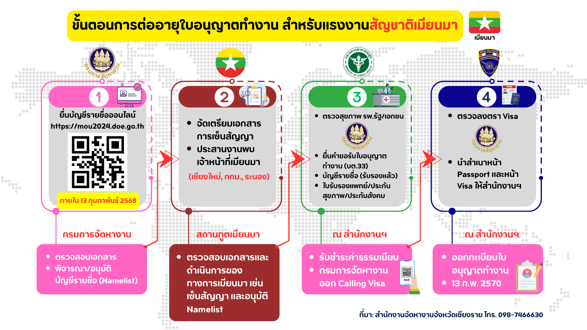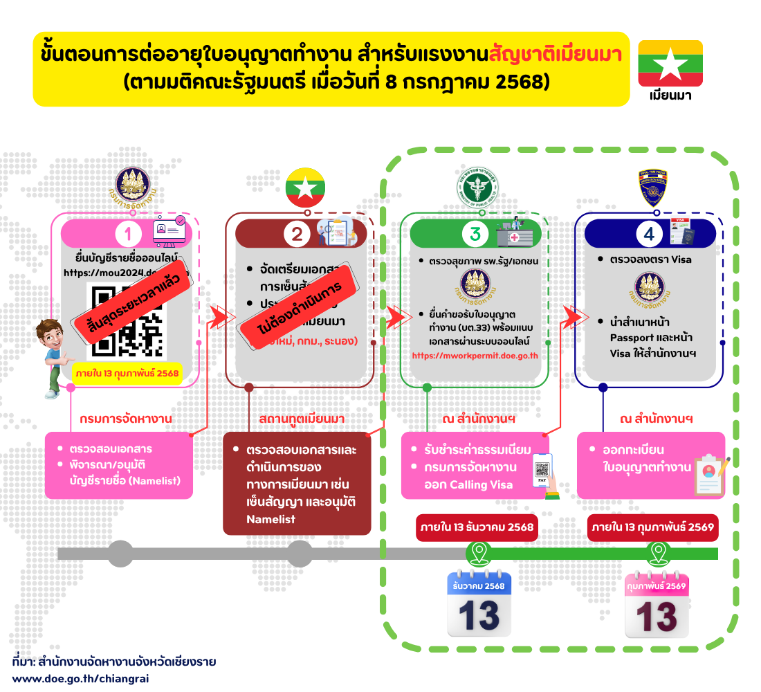 กลุ่มที่ใบอนุญาตทำงานเดิมจะหมดอายุ (13 กุมภาพันธ์ 2568) สัญชาติเมียนมา คลิกที่นี่