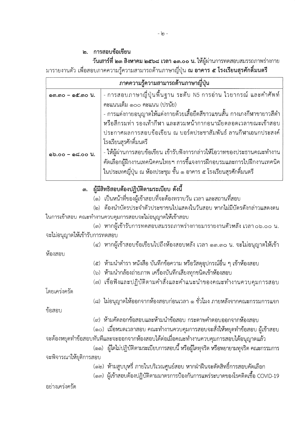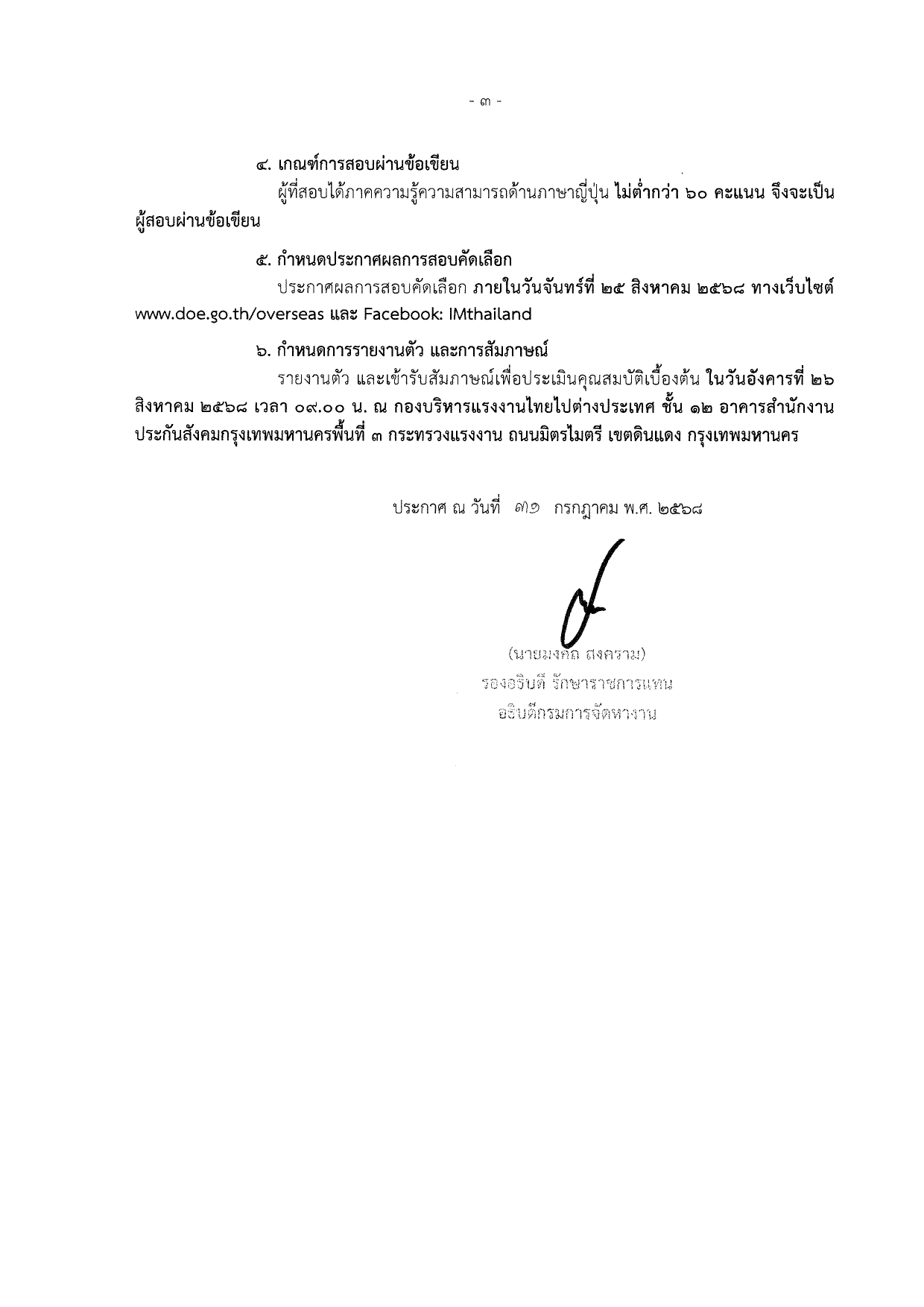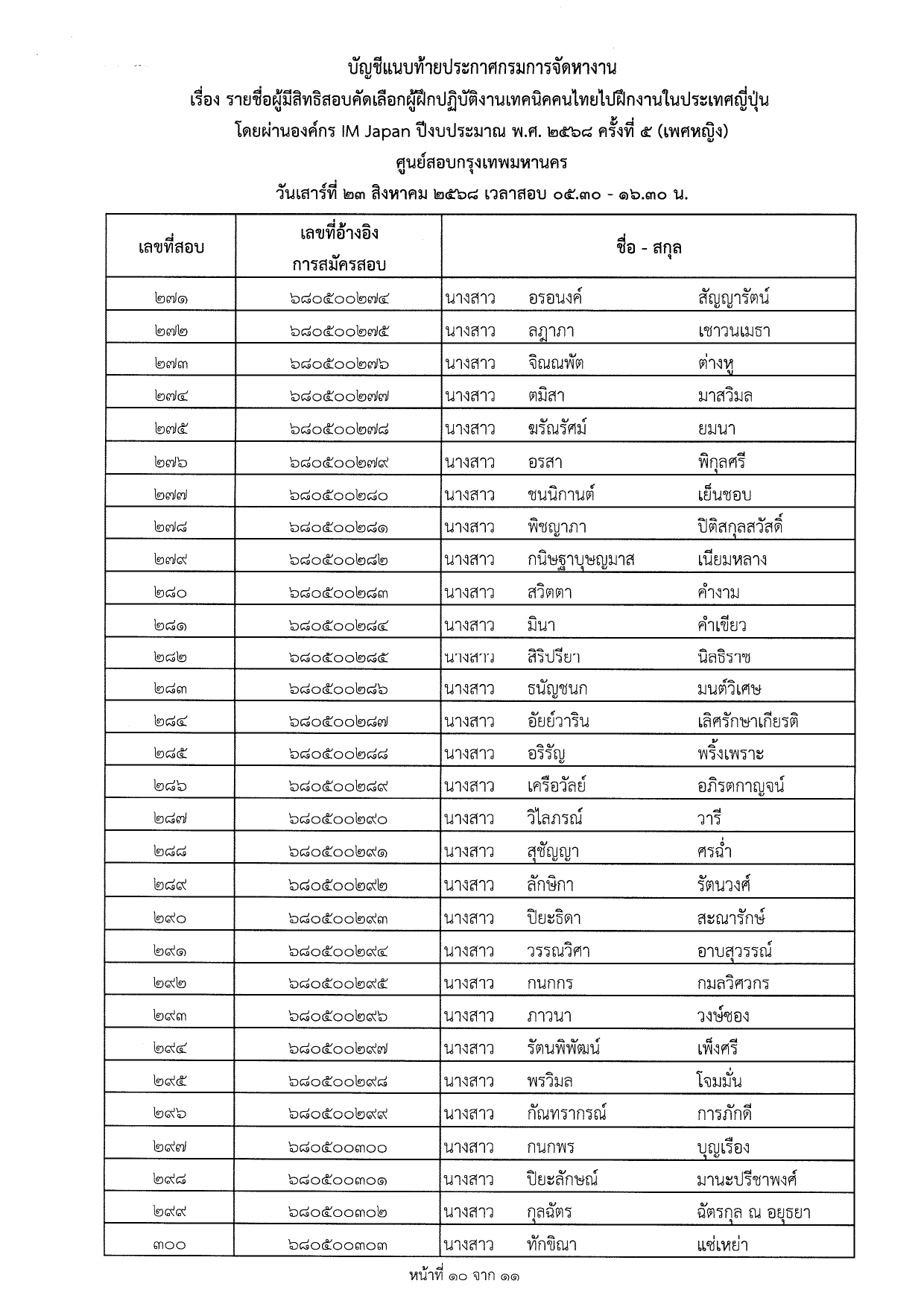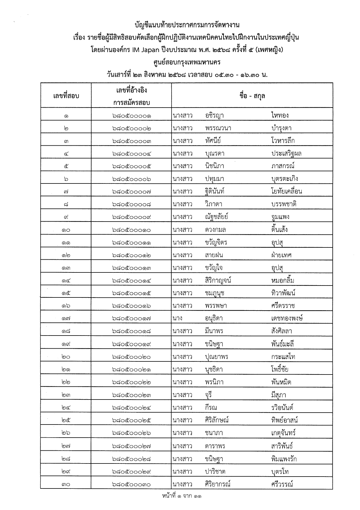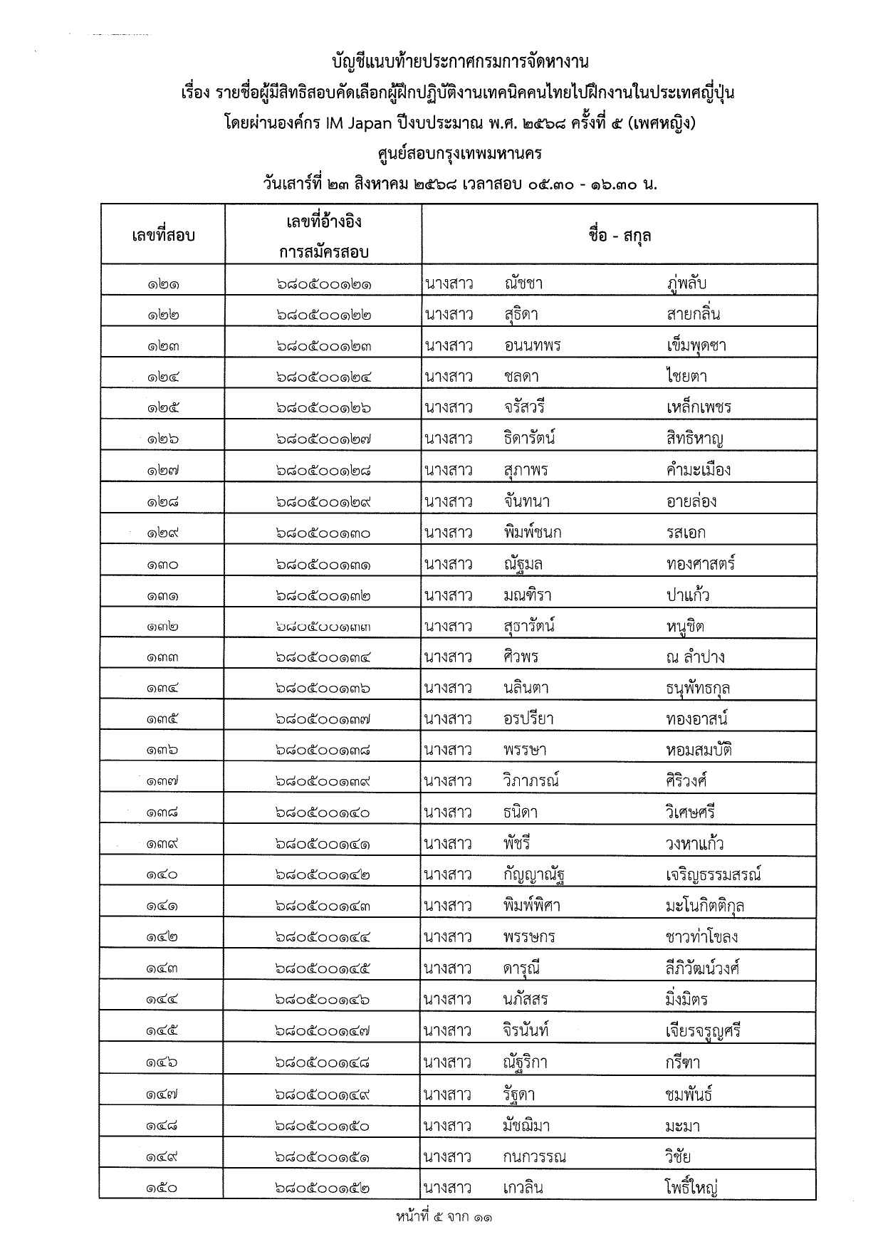 ประกาศกรมการจัดหางาน เรื่อง รายชื่อผู้มีสิทธิสอบคัดเลือกผู้ฝึกงานเทคนิคคนไทยไปฝึกงานเทคนิคในประเทศญี่ปุ่น โดยผ่านองค์กร IM Japan ปีงบประมาณ พ.ศ.2568 ครั้งที่ 5 (เพศหญิง) ณ ศูนย์สอบกรุงเทพมหานคร