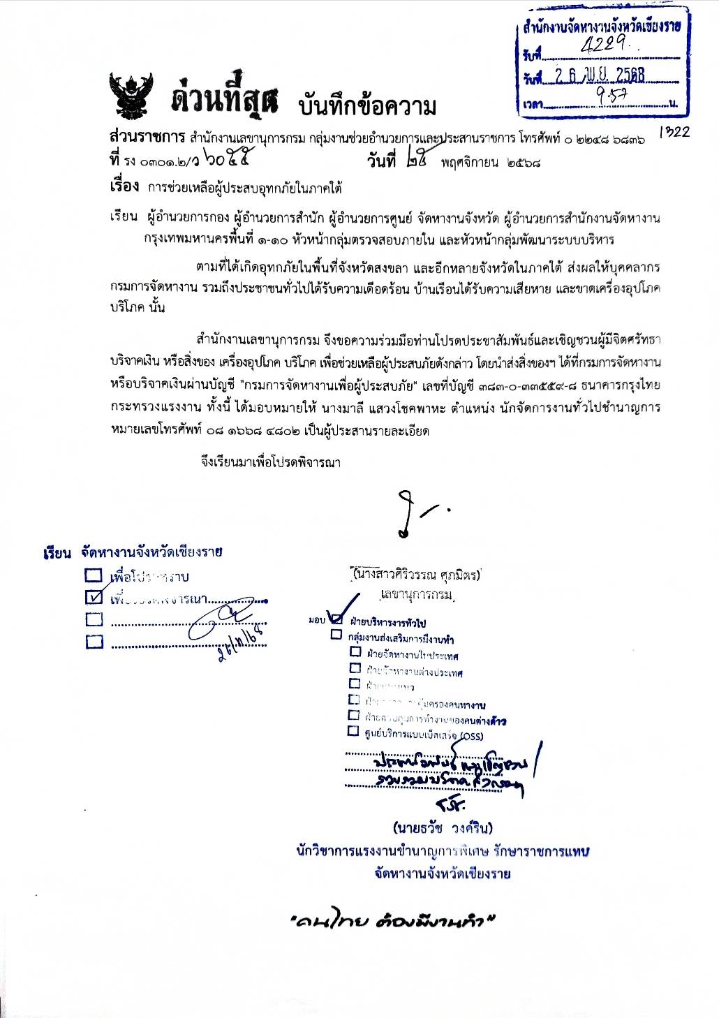 ทางสำนักงานจัดหางานจังหวัดเชียงราย ขอความร่วมมือท่านโปรดประชาสัมพันธ์และเชิญชวนผู้มีจิตศรัทธาบริจาคเงิน หรือสิ่งของ เครื่องอุปโภค บริโภค เพื่อช่วยเหลือผู้ประสบภัย โดยนำสิ่งของฯ ได้ที่กรมการจัดหางานหรือบริจาคเงินผ่านบัญชี "กรมการจัดหางานเพื่อผู้ประสบภัย" เลขที่บัญชี 383-0-33559-8 ธนาคารกรุงไทย