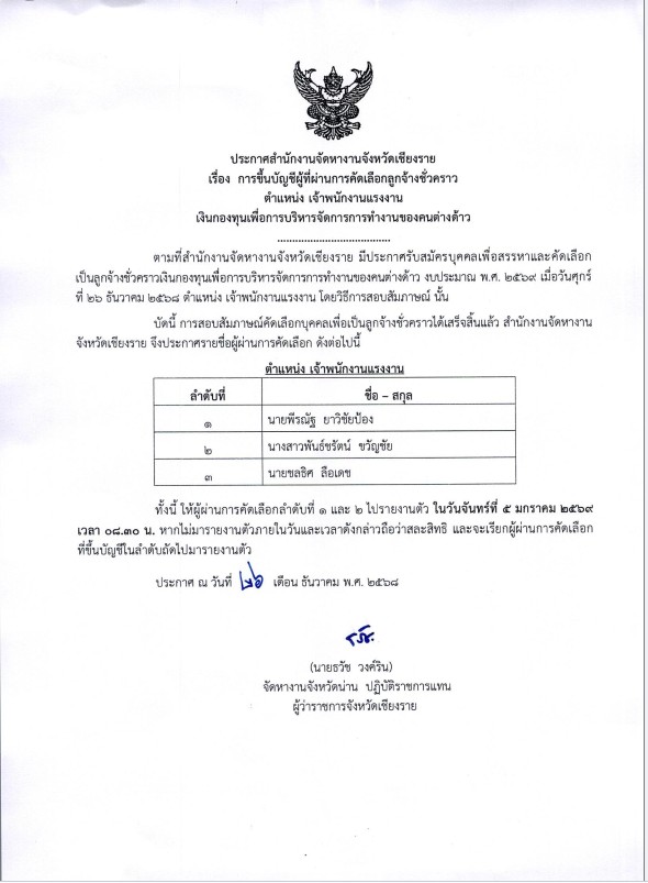 การขึ้นบัญชีผู้ที่ผ่านการคัดเลือกลูกจ้างชั่วคราว ตำแหน่ง เจ้าพนักงานแรงงาน เงินกองทุนเพื่อการบริหารจัดการการทำงานของคนต่างด้าว