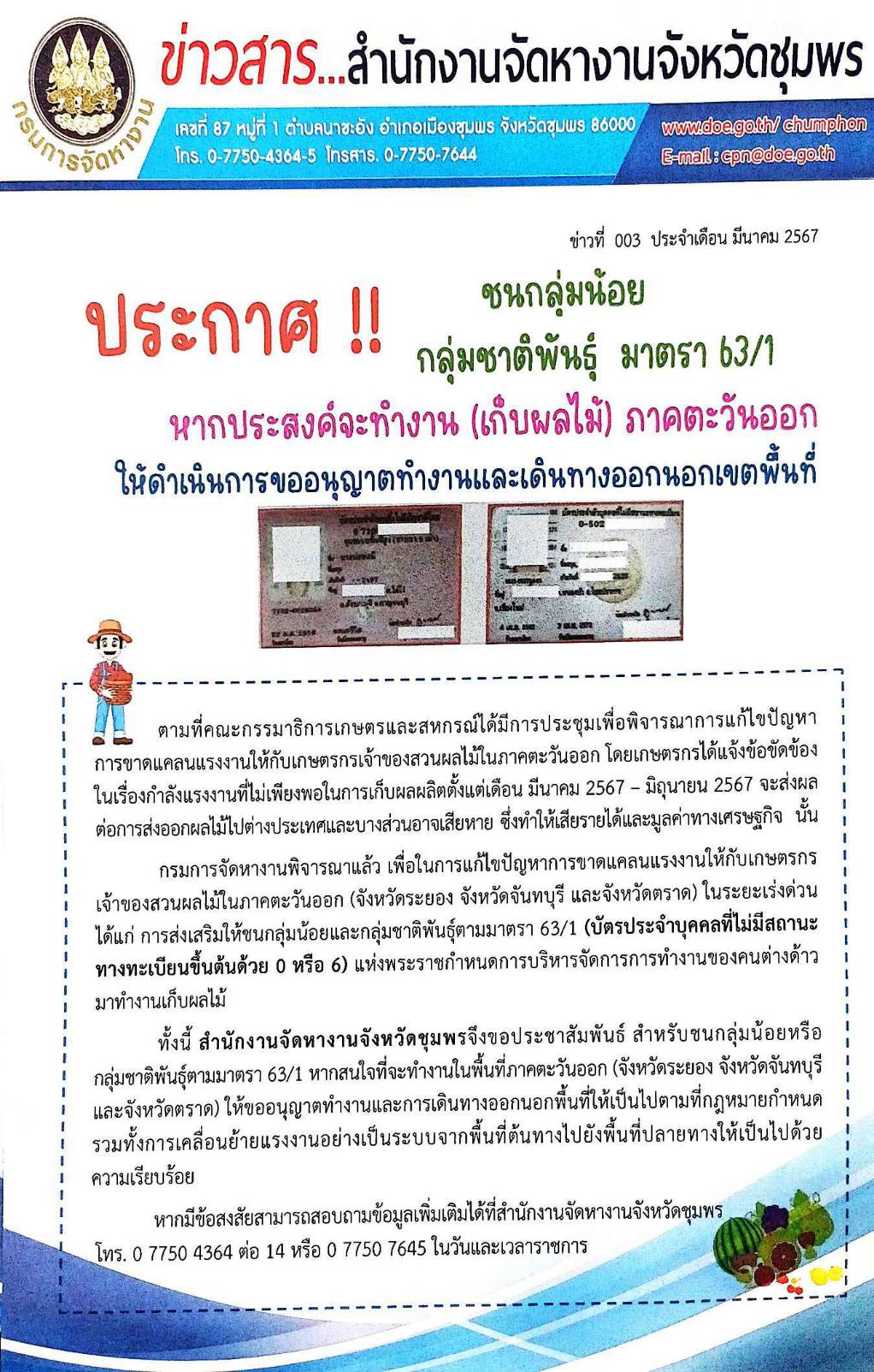ประกาศ !! ชนกลุ่มน้อย กลุ่มชาติพันธุ์ มาตรา 63/1 หากประสงค์จะทำงาน (เก็บผลไม้) ภาคตะวันออก ให้ดำเนินการขออนุญาตทำงาน
