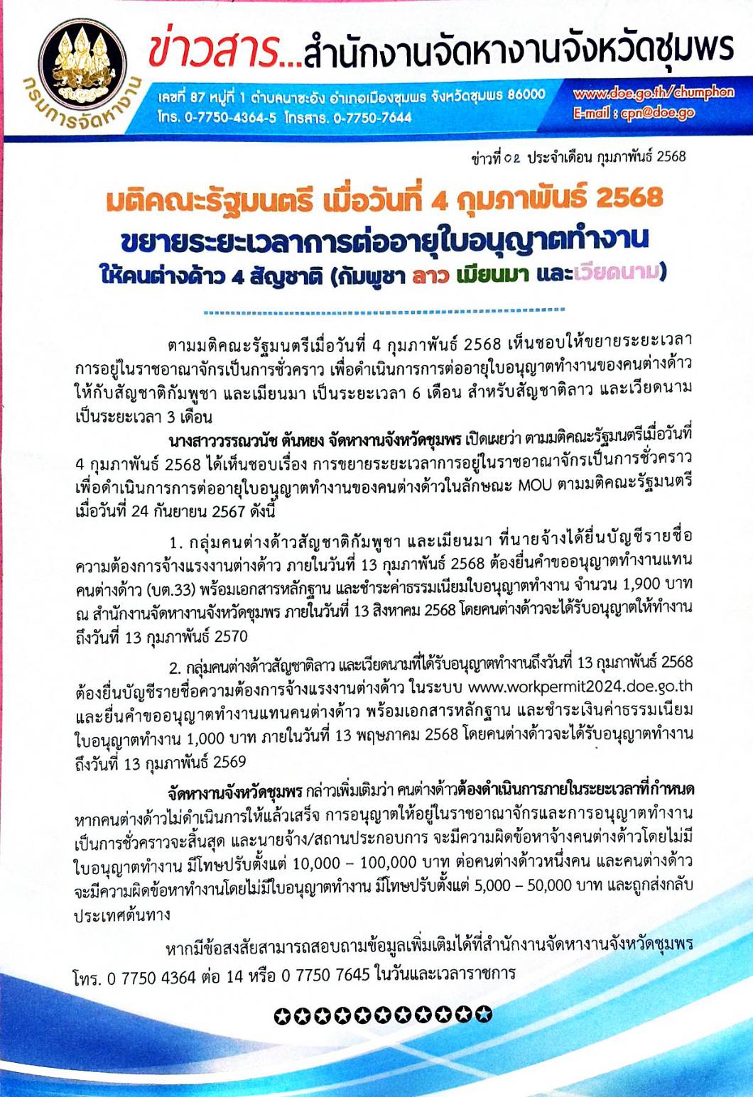 มติ ครม. 4 ก.พ.68 ขยายระยะเวลาการต่ออายุใบอนุญาตทำงาน สัญชาติ เมียนมา ลาว กัมพูชาและเวียดนาม