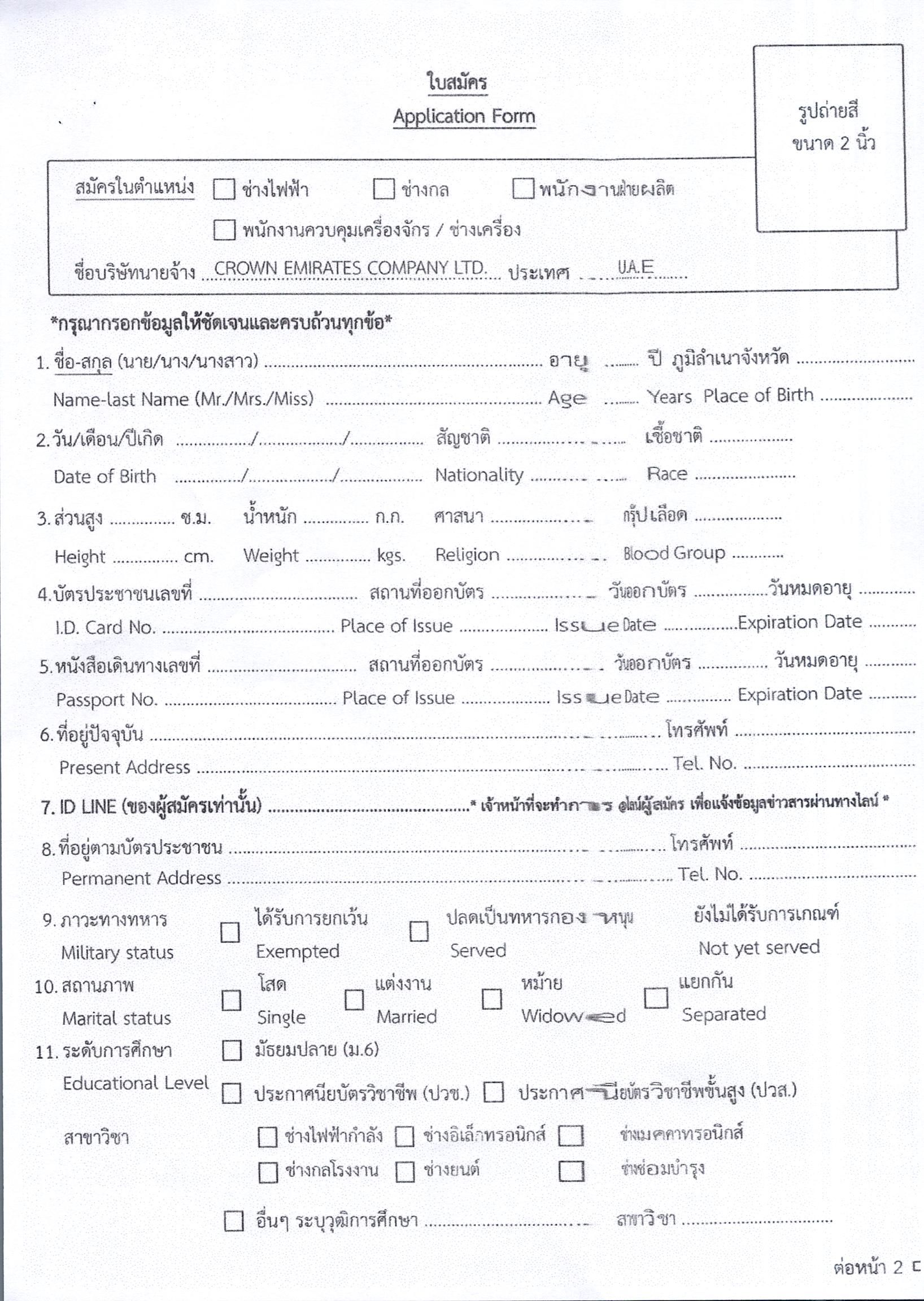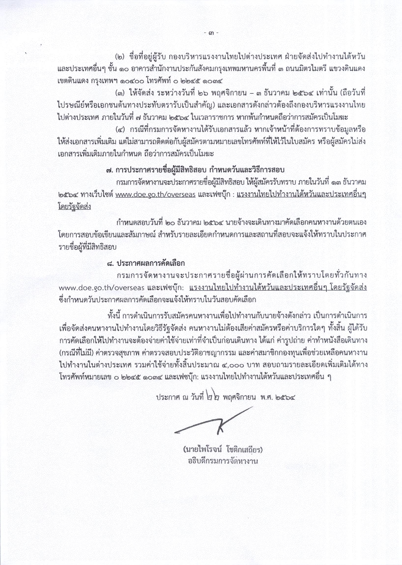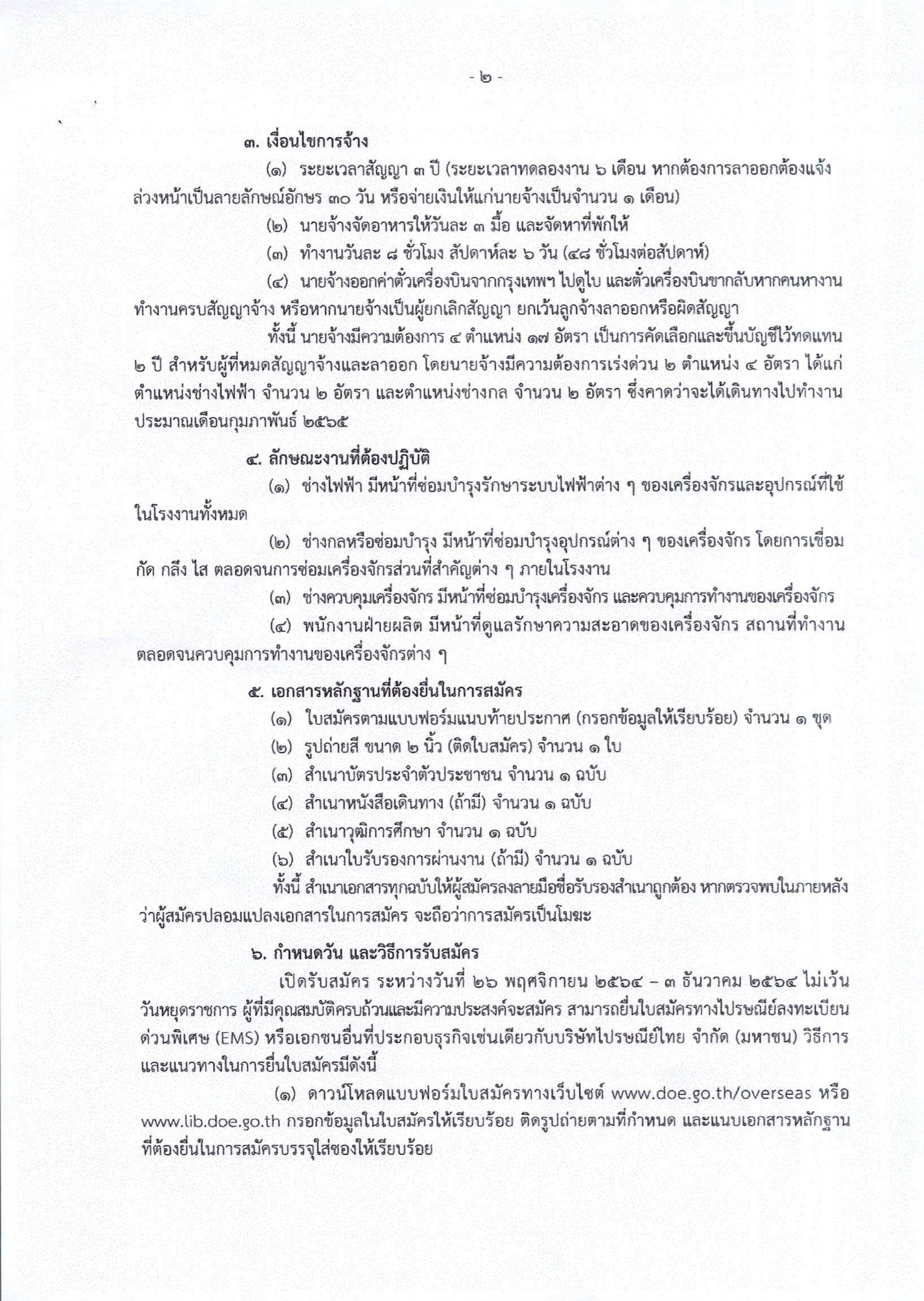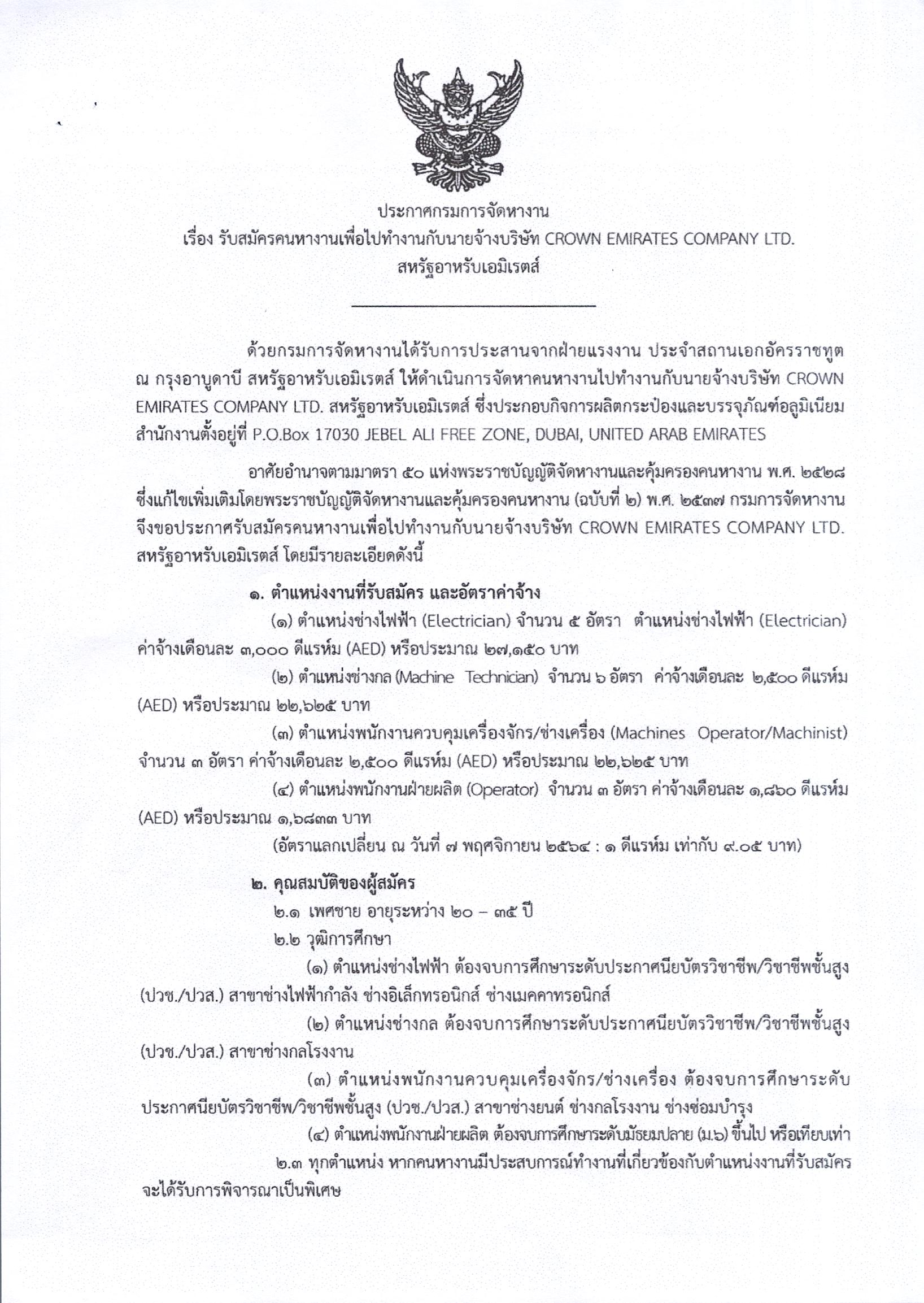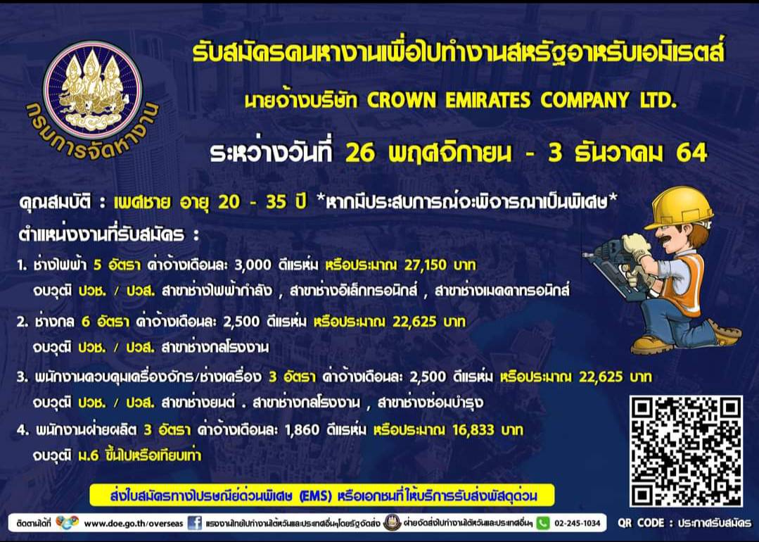 รับสมัครคนหางานเพื่อไปทำงานกับบริษัท Crown Emirates Company Ltd สหรัฐอาหรับเอมิเรตส์ จำนวน 4 ตำแหน่ง 17 อัตรา ระหว่างวันที่ 26 พฤศจิกายน - 3 ธันวาคม 2564 สมัครทางไปรษณีย์ลงทะเบียนด่วยพิเศษ (EMS) หรือเอกชนอื่นที่ประกอบธุรกิจเดียวกันกับบริษัทไปรษณีย์ไทย จำกัด (มหาชน) ดาวน์โหลดใบสมัครได้ที่ https://www.doe.go.th/overseas สอบถามรายละเอียดเพิ่มเติม 0 2245 1034 และ เฟสบุ๊ก : แรงงานไทยไปทำงานไต้หวันและประเทศอื่น ๆ