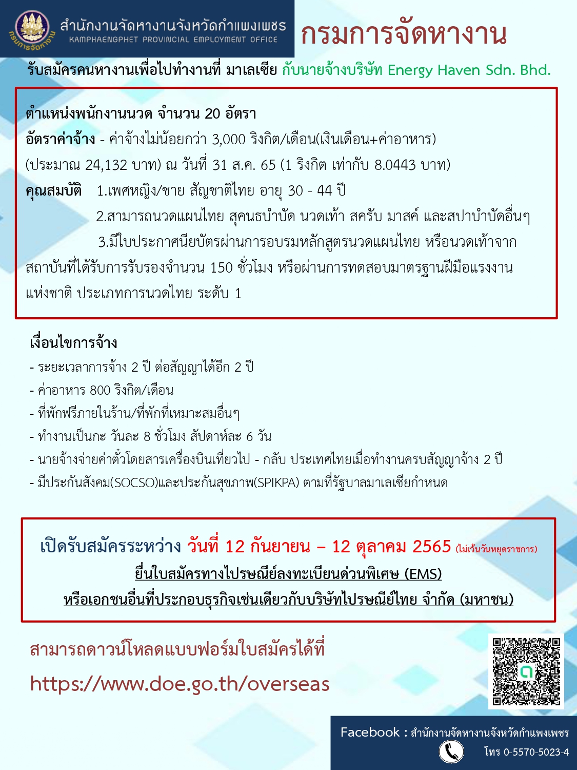 กรมการจัดหางาน รับสมัครคนหางานเพื่อไปทำงานที่มาเลเซีย กับนายจ้างบริษัท Energy Haven Sdn. Bhd.