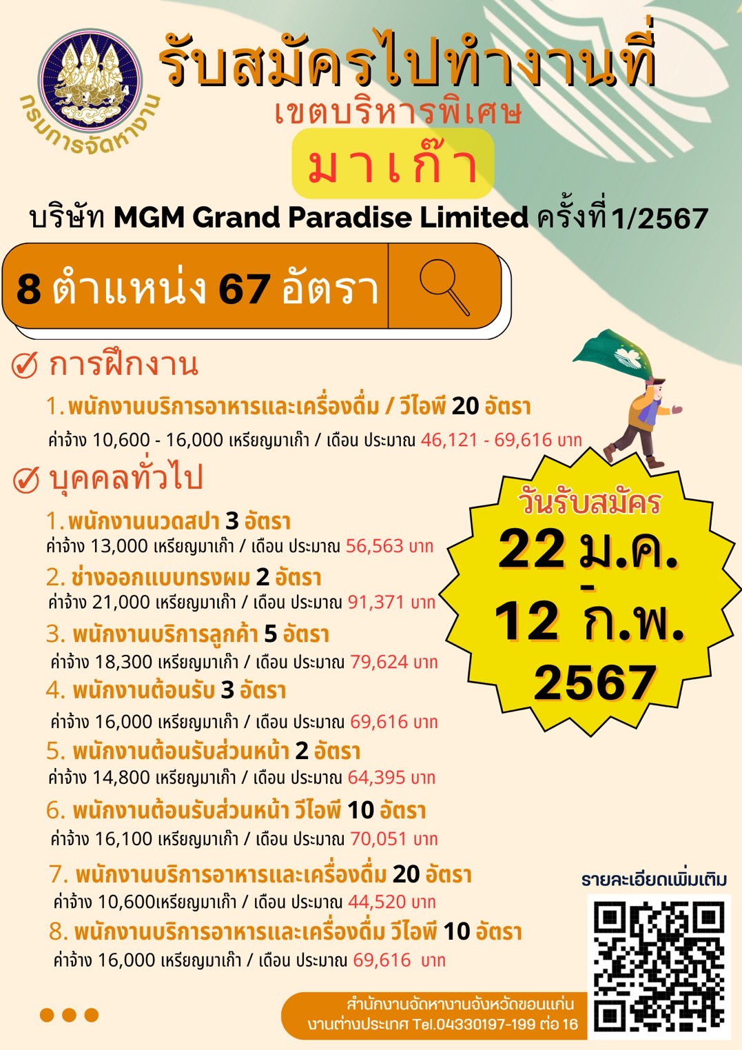 รับสมัครคนหางานไปทำงานที่มาเก๊า