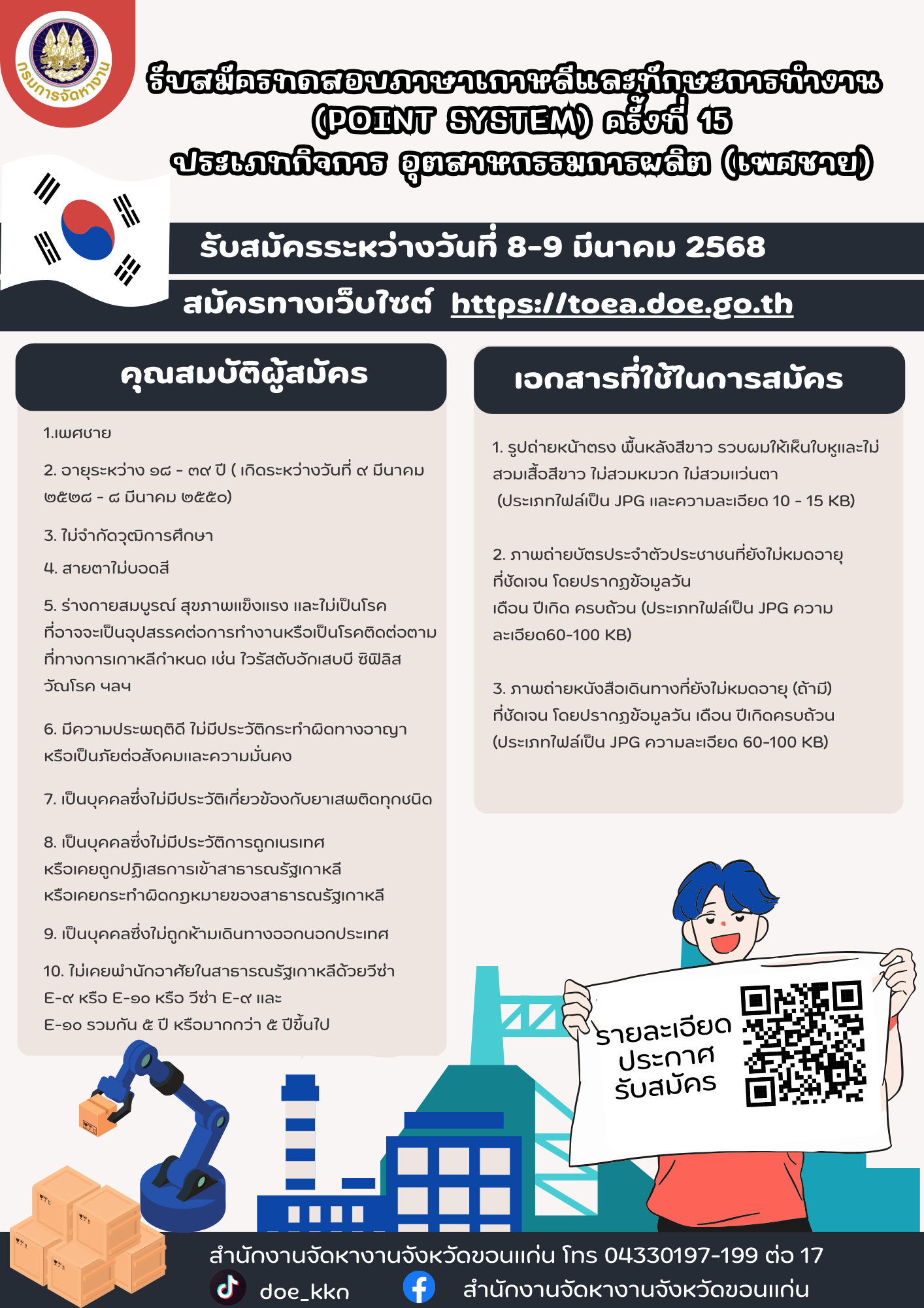 งานอุตสาหกรรม เกาหลีมาแล้ว รับสมัครชายไทย อายุ 18 - 39 ปี ทดสอบภาษาและทักษะการทำงาน เพื่่อไปทำงานที่เกาหลีตามระบบ (EPS) ระหว่างวันที่ 8-9 มีนาคม 2568 นี้ ต้องเตรียมตัว เตรียมเอกสารอะไบ้าง คลิกเลย