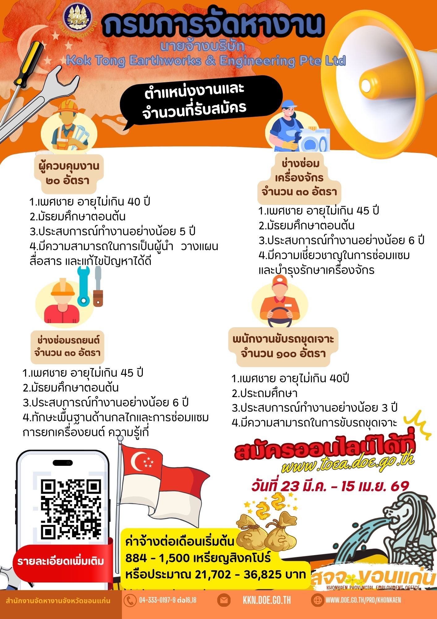 ประกาศกรมการจัดหางาน เรื่อง รับสมัครคนหางานเพื่อไปทำงานในประเทศสิงคโปร์ กับนายจ้างบริษัท Kok Tong Earthworks & Engineering Pte Ltd ระหว่างวันที่ 23 มีนาคม - 15 เมษายน 2569 ตำแหน่งงานและจำนวนที่รับสมัคร // ผู้ควบคุมงาน (Foreman) จำนวน 20 อัตรา // พนักงานขับรถขุดเจาะ (Excavator Operator) จำนวน 100 อัตรา // ช่างซ่อมเครื่องจักร (Machinery Mechanic) จำนวน 30 อัตรา // ช่างซ่อมรถยนต์ (Motor Vehicle Mechanic) จำนวน 30 อัตรา เพิ่มเติม... https://www.doe.go.th/.../a6e2e3db044b3cfd636a79516697c76...