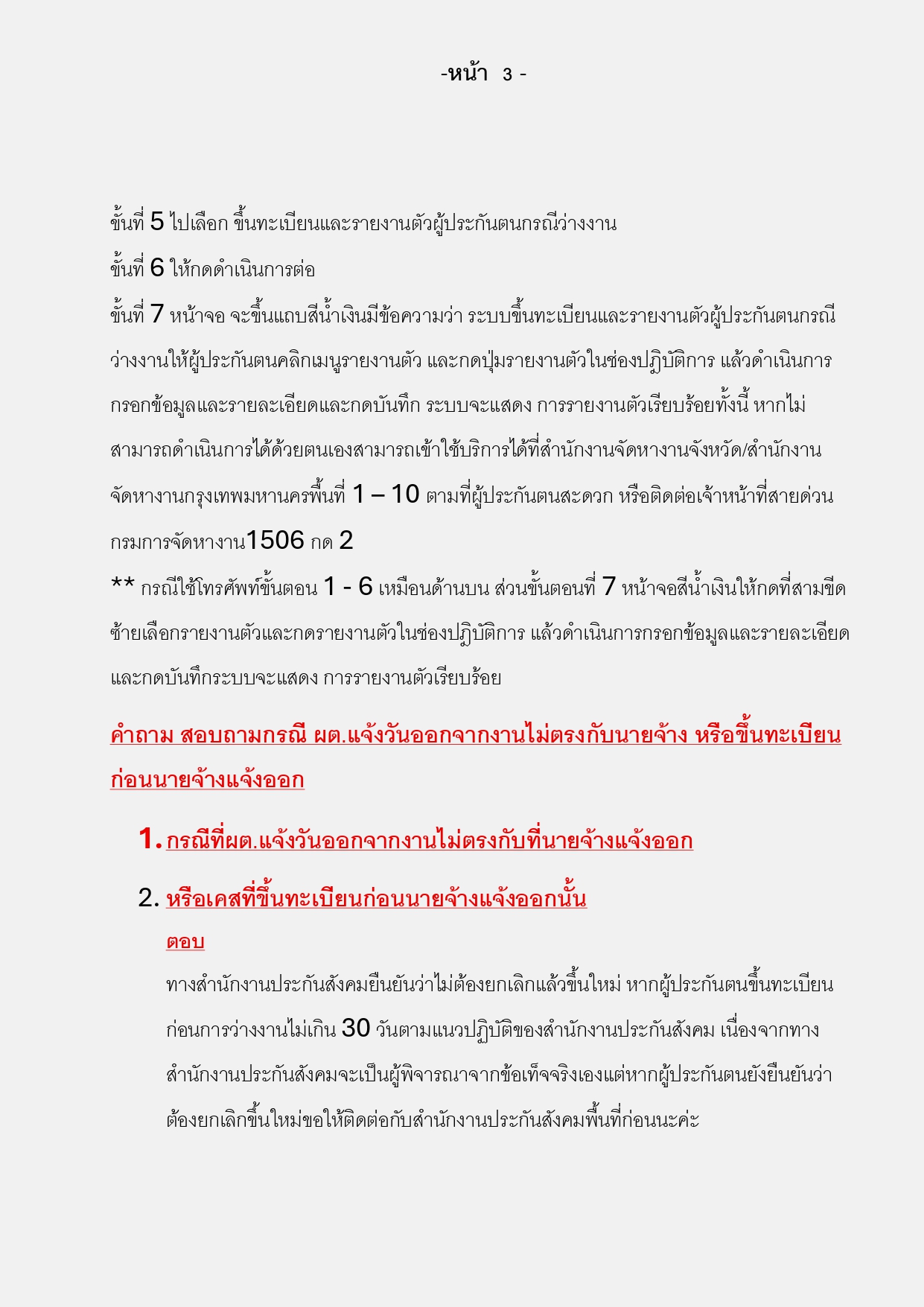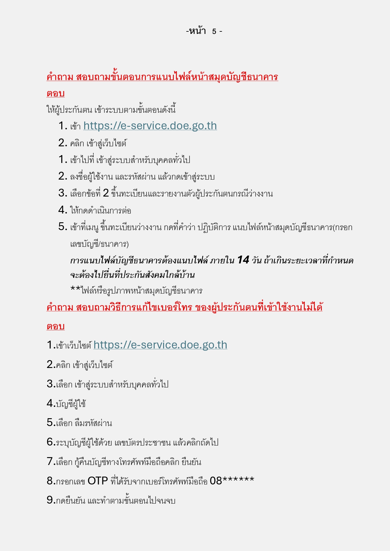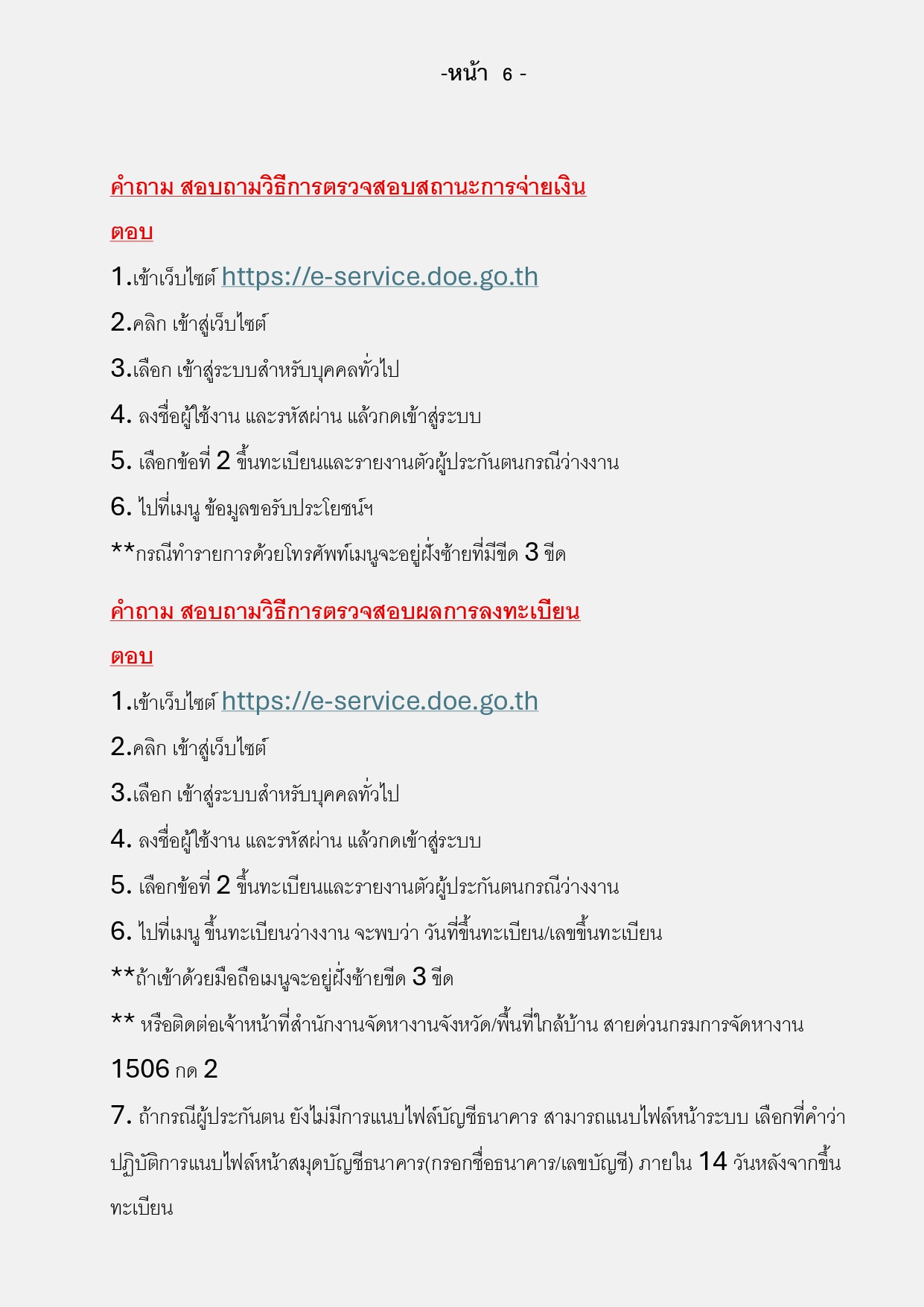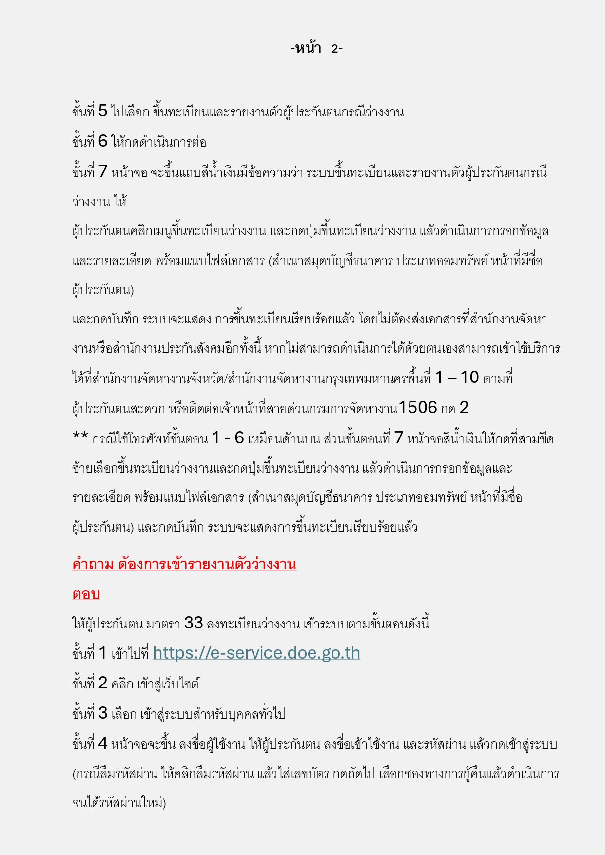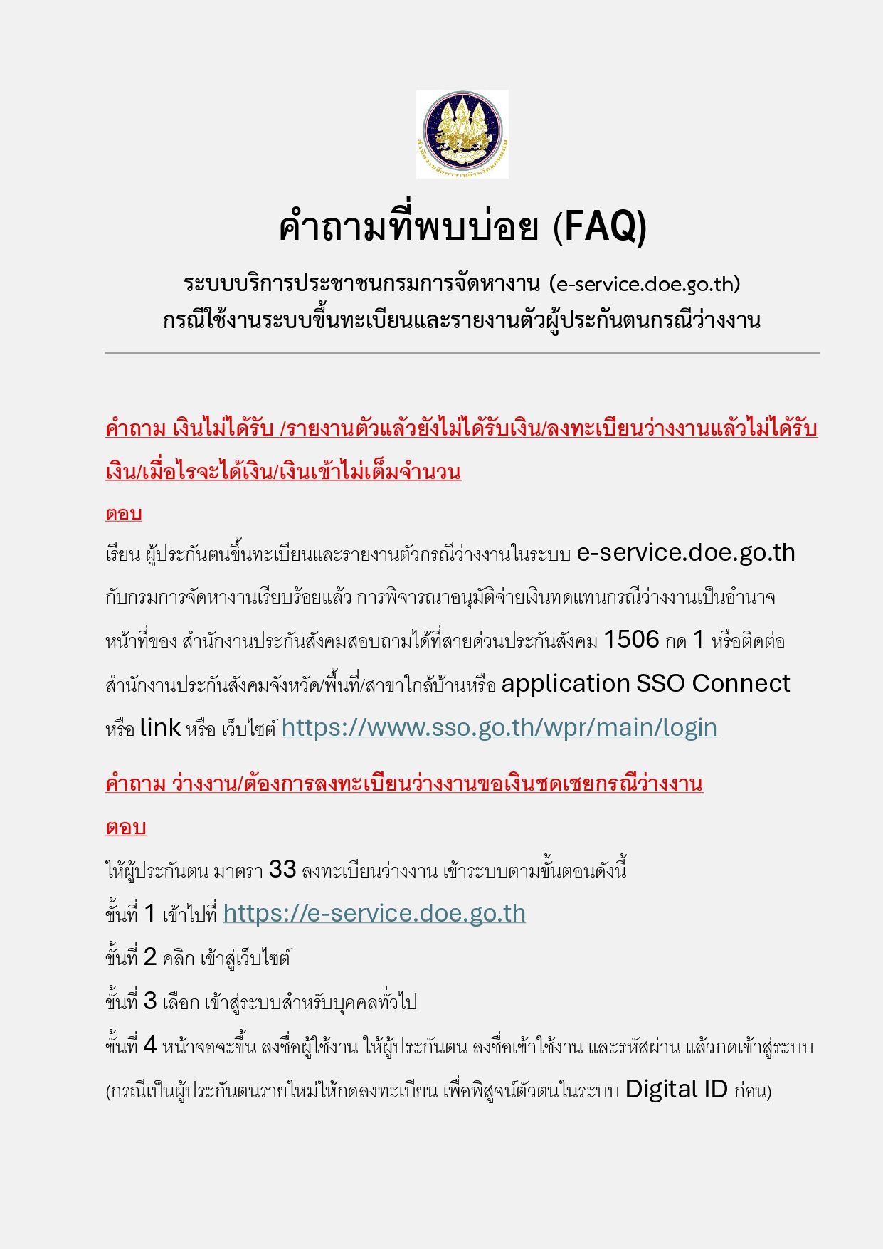 คำถามที่พบบ่อย (FAQ) ระบบบริการประชาชนกรมการจัดหางาน (e-service.doe.go.th) กรณีใช้งานระบบขึ้นทะเบียนและรายงานตัวผู้ประกันตนกรณีว่างงาน