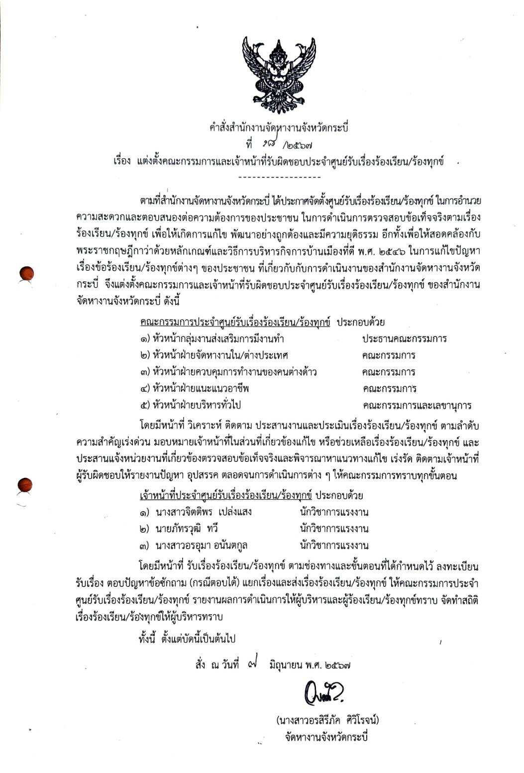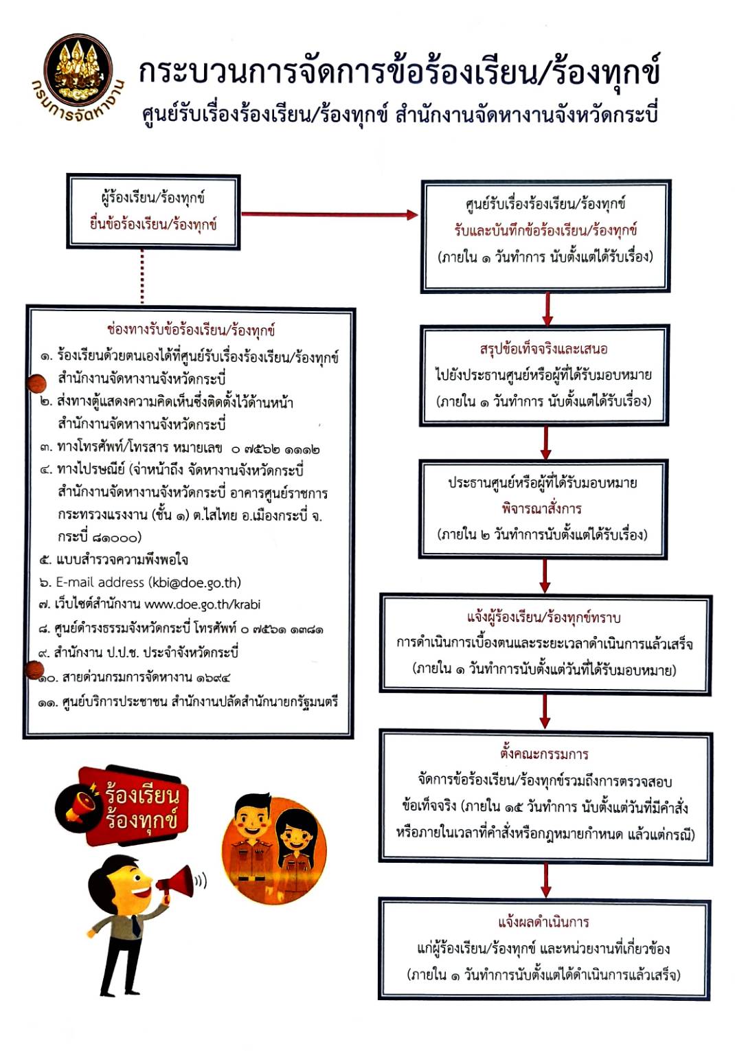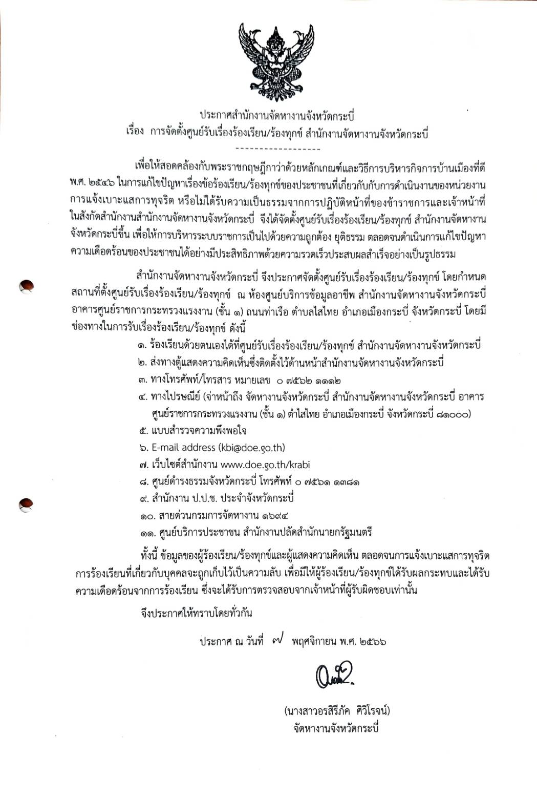 จัดตั้งศูนย์รับเรื่องร้องเรียน/ร้องทุกข์ สำนักงานจัดหางานจังหวัดกระบี่