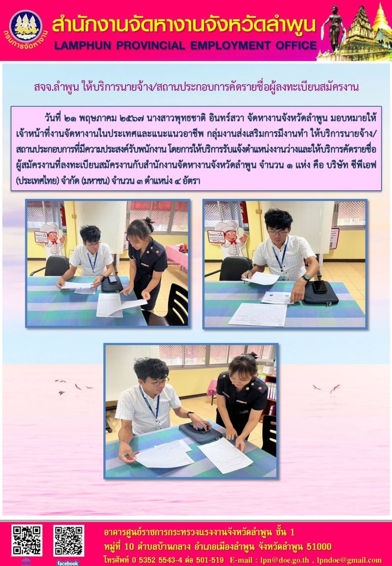 วันที่ 21 พฤษภาคม 2567 นางสาวพุทธชาติ อินทร์สวา จัดหางานจังหวัดลำพูน มอบหมายให้ เจ้าหน้าที่งานจัดหางานในประเทศและแนะแนวอาชีพ กลุ่มงานส่งเสริมการมีงานทำ ให้บริการนายจ้าง/สถานประกอบการที่มีความประสงค์รับพนักงาน โดยการให้บริการรับเเจ้งตำเเหน่งงานว่างเเละให้บริการคัดรายชื่อผู้สมัครงานที่ลงทะเบียนสมัครงานกับสำนักงานจัดหางานจังหวัดลำพูน จำนวน 1 เเห่ง คือ บริษัท ซีพีเอฟ (ประเทศไทย) จำกัด (มหาชน) จำนวน 3 ตำแหน่ง 4 อัตรา