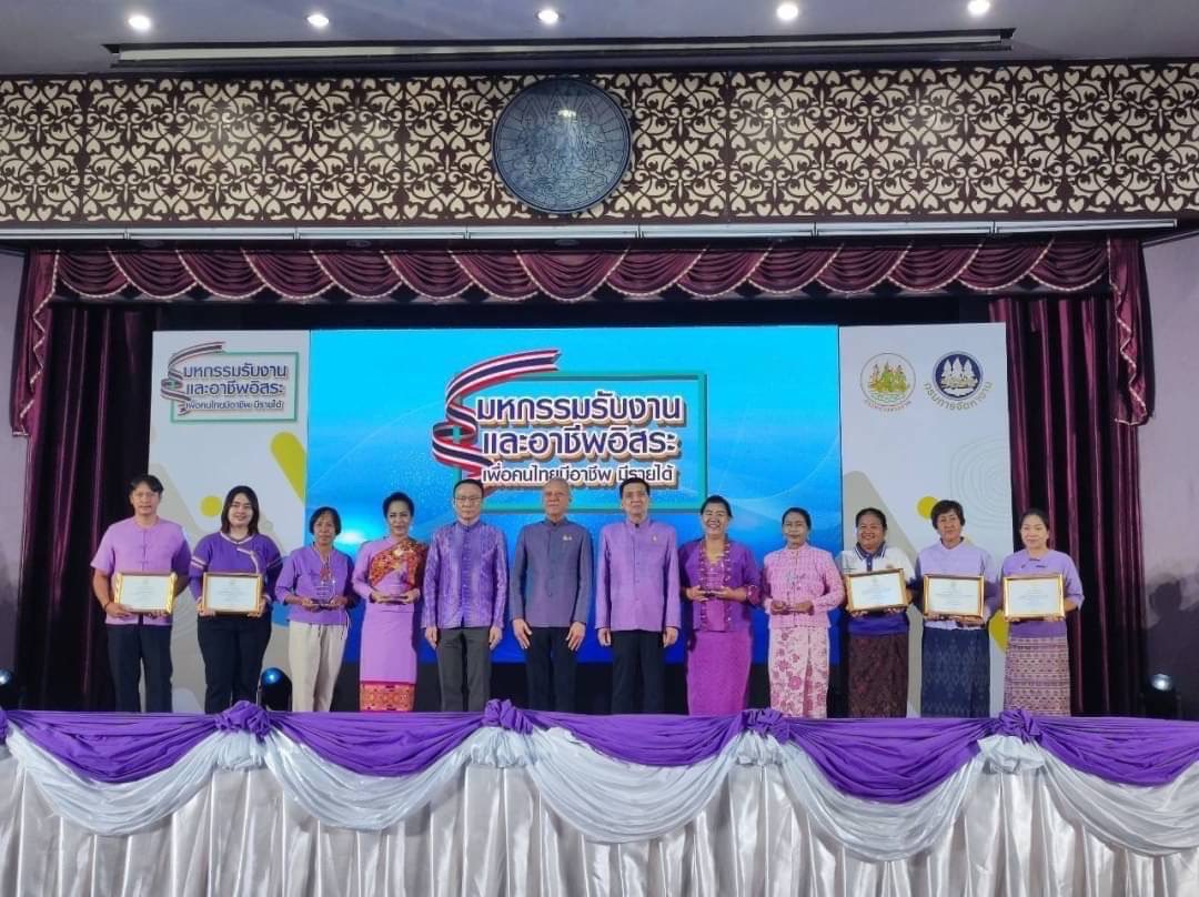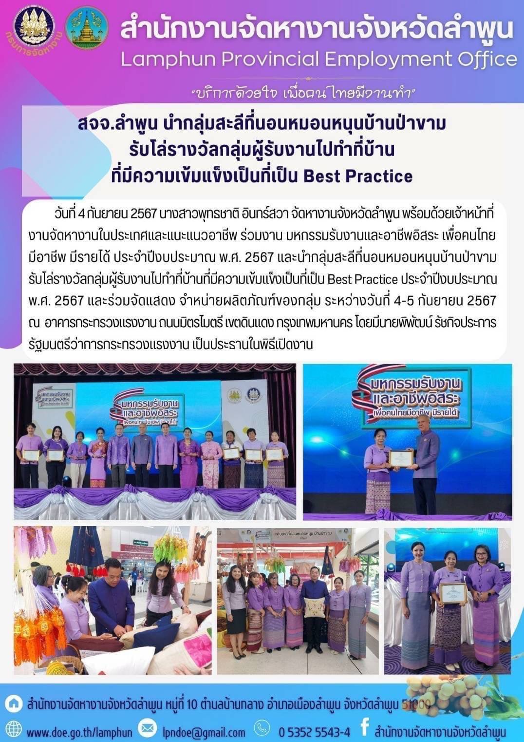 วันที่ 4 กันยายน 2567 นางสาวพุทธชาติ อินทร์สวา จัดหางานจังหวัดลำพูน พร้อมด้วยเจ้าหน้าที่งานจัดหางานในประเทศและแนะแนวอาชีพ ร่วมงาน มหกรรมรับงานและอาชีพอิสระ เพื่อคนไทยมีอาชีพ มีรายได้ ประจำปีงบประมาณ พ.ศ. 2567 และนำกลุ่มสะลีที่นอนหมอนหนุนบ้านป่าขาม รับโล่รางวัลกลุ่มผู้รับงานไปทำที่บ้านที่มีความเข้มแข็งเป็นที่เป็น Best Practice ประจำปีงบประมาณ พ.ศ. 2567 และร่วมจัดแสดง จำหน่ายผลิตภัณฑ์ของกลุ่ม ระหว่างวันที่ 4-5 กันยายน 2567 ณ อาคารกระทรวงแรงงาน ถนนมิตรไมตรี เขตดินแดง กรุงเทพมหานคร โดยมีนายพิพัฒน์ รัชกิจประการ รัฐมนตรีว่าการกระทรวงแรงงาน เป็นประธานในพิธีเปิดงาน