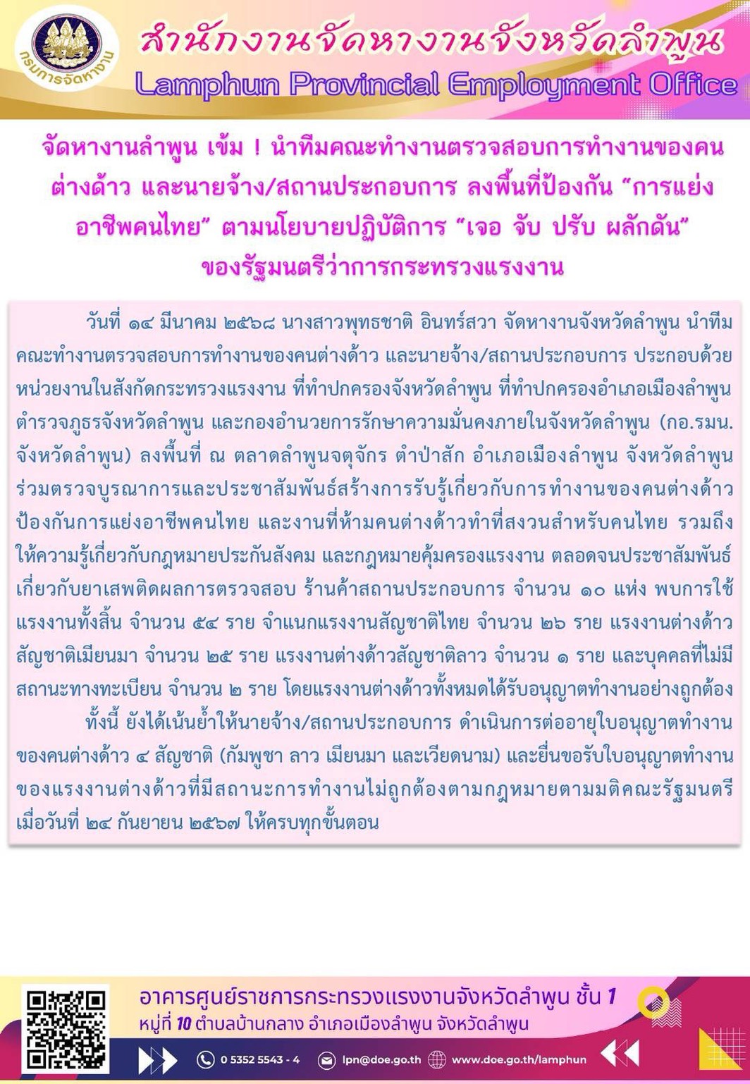 จัดหางานลำพูน เข้ม ! นำทีมคณะทำงานตรวจสอบการทำงานของคนต่างด้าว และนายจ้าง/สถานประกอบการ ลงพื้นที่ป้องกัน “การแย่งอาชีพคนไทย” ตามนโยบายปฏิบัติการ “เจอ จับ ปรับ ผลักดัน” ของรัฐมนตรีว่าการกระทรวงแรงงาน