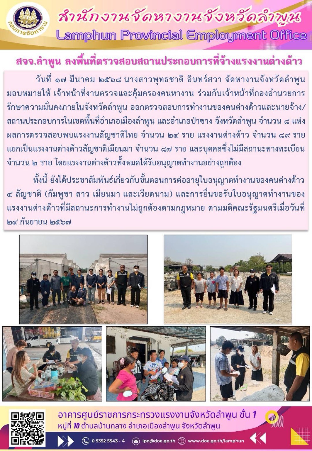 วันที่ 17 มีนาคม 2568 นางสาวพุทธชาติ อินทร์สวา จัดหางานจังหวัดลำพูนมอบหมายให้ เจ้าหน้าที่งานตรวจและคุ้มครองคนหางาน ร่วมกับเจ้าหน้าที่กองอำนวยการ รักษาความมั่นคงภายในจังหวัดลำพูน ออกตรวจสอบการทำงานของคนต่างด้าวและนายจ้าง/สถานประกอบการในเขตพื้นที่อำเภอเมืองลำพูน และอำเภอป่าซาง จังหวัดลำพูน จำนวน 8 แห่ง ผลการตรวจสอบพบแรงงานสัญชาติไทย จำนวน 24 ราย แรงงานต่างด้าว จำนวน 89 ราย แยกเป็นแรงงานต่างด้าวสัญชาติเมียนมา จำนวน 87 ราย และบุคคลซึ่งไม่มีสถานะทางทะเบียน จำนวน 2 ราย โดยแรงงานต่างด้าวทั้งหมดได้รับอนุญาตทำงานอย่างถูกต้อง