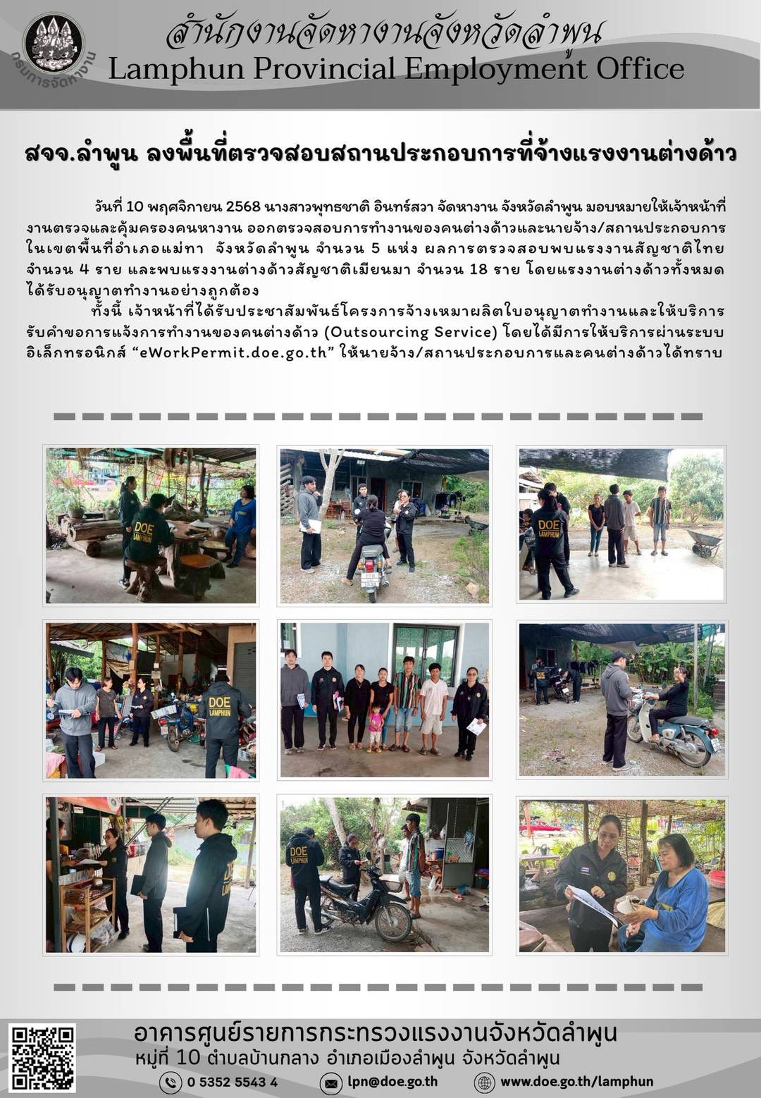 วันที่ 10 พฤศจิกายน 2568 นางสาวพุทธชาติ อินทร์สวา จัดหางานจังหวัดลำพูน มอบหมายให้เจ้าหน้าที่งานตรวจและคุ้มครองคนหางาน ออกตรวจสอบการทำงานของคนต่างด้าวและนายจ้าง/สถานประกอบการในเขตพื้นที่อำเภอแม่ทา จังหวัดลำพูน จำนวน 5 แห่ง ผลการตรวจสอบพบแรงงานสัญชาติไทย จำนวน 4 ราย และพบแรงงานต่างด้าวสัญชาติเมียนมา จำนวน 18 ราย โดยแรงงานต่างด้าวทั้งหมดได้รับอนุญาตทำงานอย่างถูกต้อง