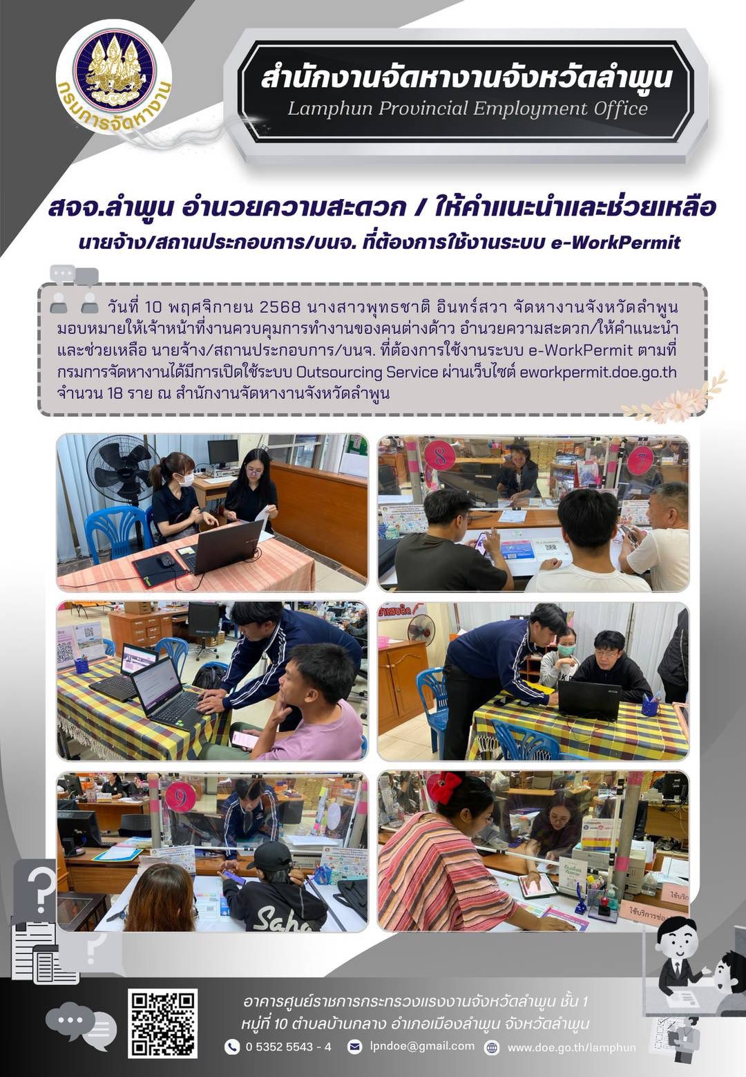 วันที่ 10 พฤศจิกายน 2568 นางสาวพุทธชาติ อินทร์สวา จัดหางานจังหวัดลำพูน มอบหมายให้เจ้าหน้าที่งานควบคุมการทำงานของคนต่างด้าว อำนวยความสะดวก/ให้คำแนะนำ และช่วยเหลือ นายจ้าง/สถานประกอบการ/บนจ. ที่ต้องการใช้งานระบบ e-WorkPermit ตามที่กรมการจัดหางานได้มีการเปิดใช้ระบบ Outsourcing Service ผ่านเว็บไซต์ eworkpermit.doe.go.th จำนวน 18 ราย ณ สำนักงานจัดหางานจังหวัดลำพูน