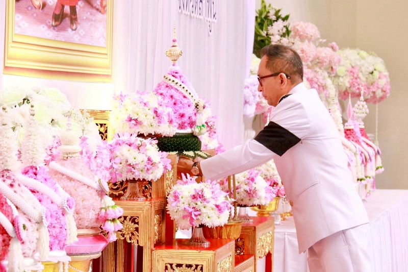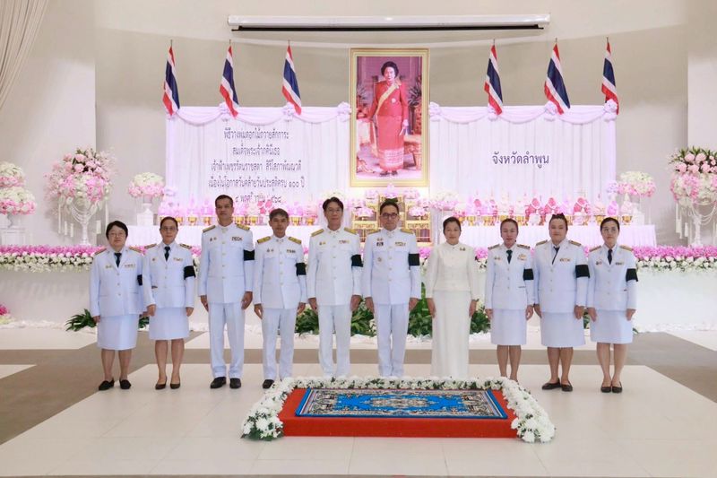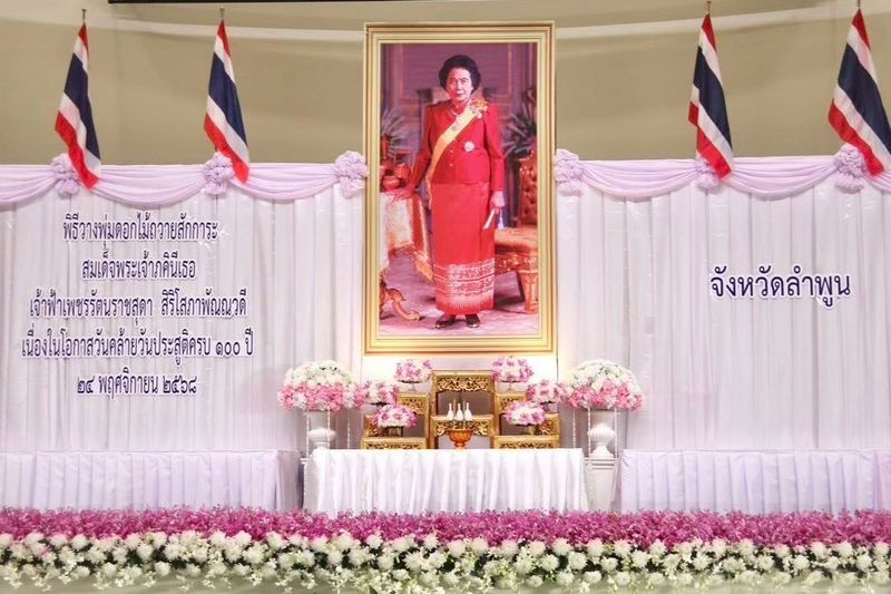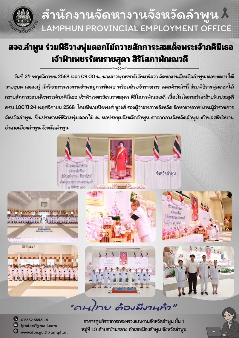 วันที่ 24 พฤศจิกายน 2568 เวลา 09.00 น. นางสาวพุทธชาติ อินทร์สวา จัดหางานจังหวัดลำพูน มอบหมายให้นายอุบล แมลงภู่ นักวิชาการแรงงานชำนาญการพิเศษ พร้อมด้วยข้าราชการ และเจ้าหน้าที่ ร่วมพิธีวางพุ่มดอกไม้ถวายสักการะสมเด็จพระเจ้าภคินีเธอ เจ้าฟ้าเพชรรัตนราชสุดา สิริโสภาพัณณวดี เนื่องในโอกาสวันคล้ายวันประสูติ ครบ 100 ปี 24 พฤศจิกายน 2568 โดยมีนายปิยพงศ์ ชูวงศ์ รองผู้ว่าราชการจังหวัด รักษาราชการแทนผู้ว่าราชการจังหวัดลำพูน เป็นประธานพิธีวางพุ่มดอกไม้ ณ หอประชุมจังหวัดลำพูน ศาลากลางจังหวัดลำพูน ตำบลศรีบัวบาน อำเภอเมืองลำพูน จังหวัดลำพูน
