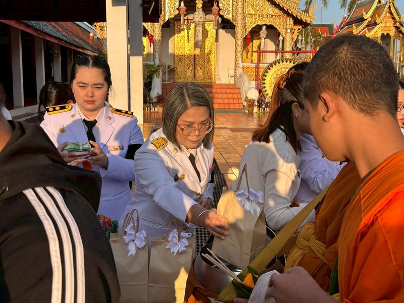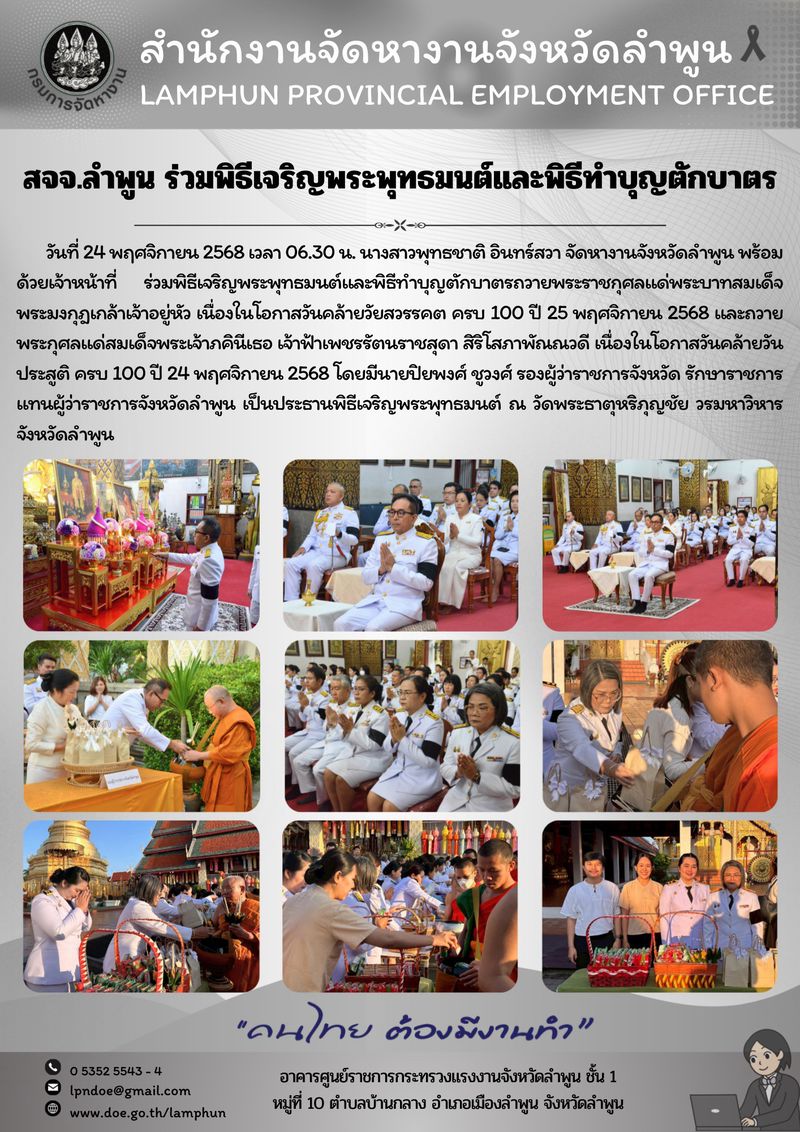 วันที่ 24 พฤศจิกายน 2568 เวลา 06.30 น. นางสาวพุทธชาติ อินทร์สวา จัดหางานจังหวัดลำพูน พร้อมด้วยเจ้าหน้าที่ ร่วมพิธีเจริญพระพุทธมนต์และพิธีทำบุญตักบาตรถวายพระราชกุศลแด่พระบาทสมเด็จพระมงกุฎเกล้าเจ้าอยู่หัว เนื่องในโอกาสวันคล้ายวัยสวรรคต ครบ 100 ปี 25 พฤศจิกายน 2568 และถวายพระกุศลแด่สมเด็จพระเจ้าภคินีเธอ เจ้าฟ้าเพชรรัตนราชสุดา สิริโสภาพัณณวดี เนื่องในโอกาสวันคล้ายวันประสูติ ครบ 100 ปี 24 พฤศจิกายน 2568 โดยมีนายปิยพงศ์ ชูวงศ์ รองผู้ว่าราชการจังหวัด รักษาราชการแทนผู้ว่าราชการจังหวัดลำพูน เป็นประธานพิธีเจริญพระพุทธมนต์ ณ วัดพระธาตุหริภุญชัย วรมหาวิหาร จังหวัดลำพูน